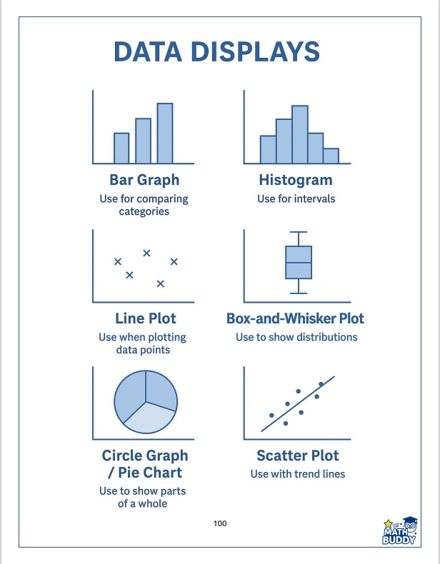 Graphs, data displays, trend lines, probability models, box plots, histograms, and real-world data analysis skills.
