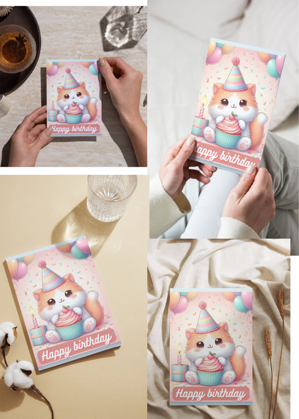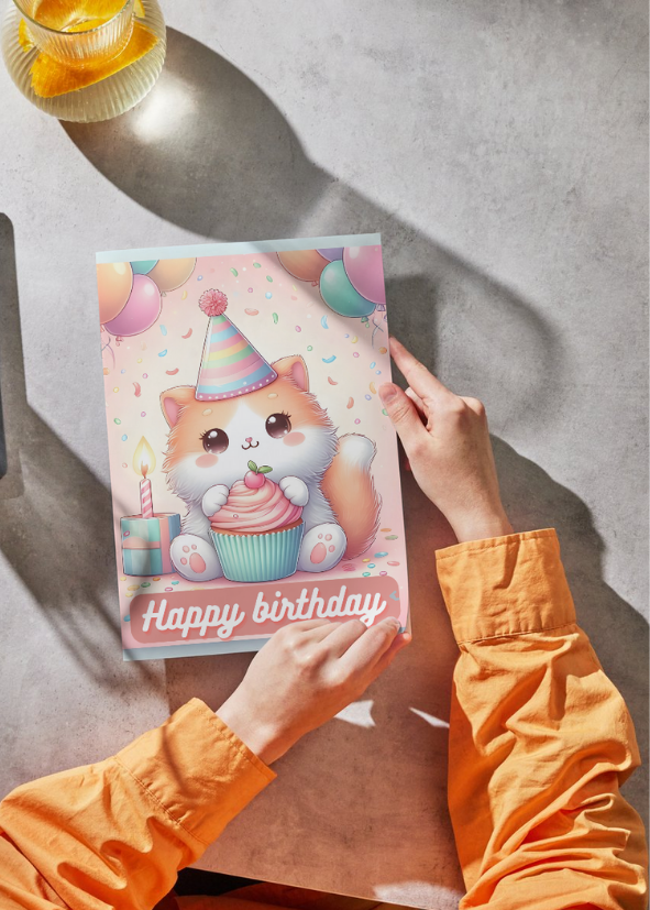 * One High-Quality Happy Birthday Card Design: As shown, complete with the irresistible fluffy cat, cupcake, and 'Happy Birthday' text.