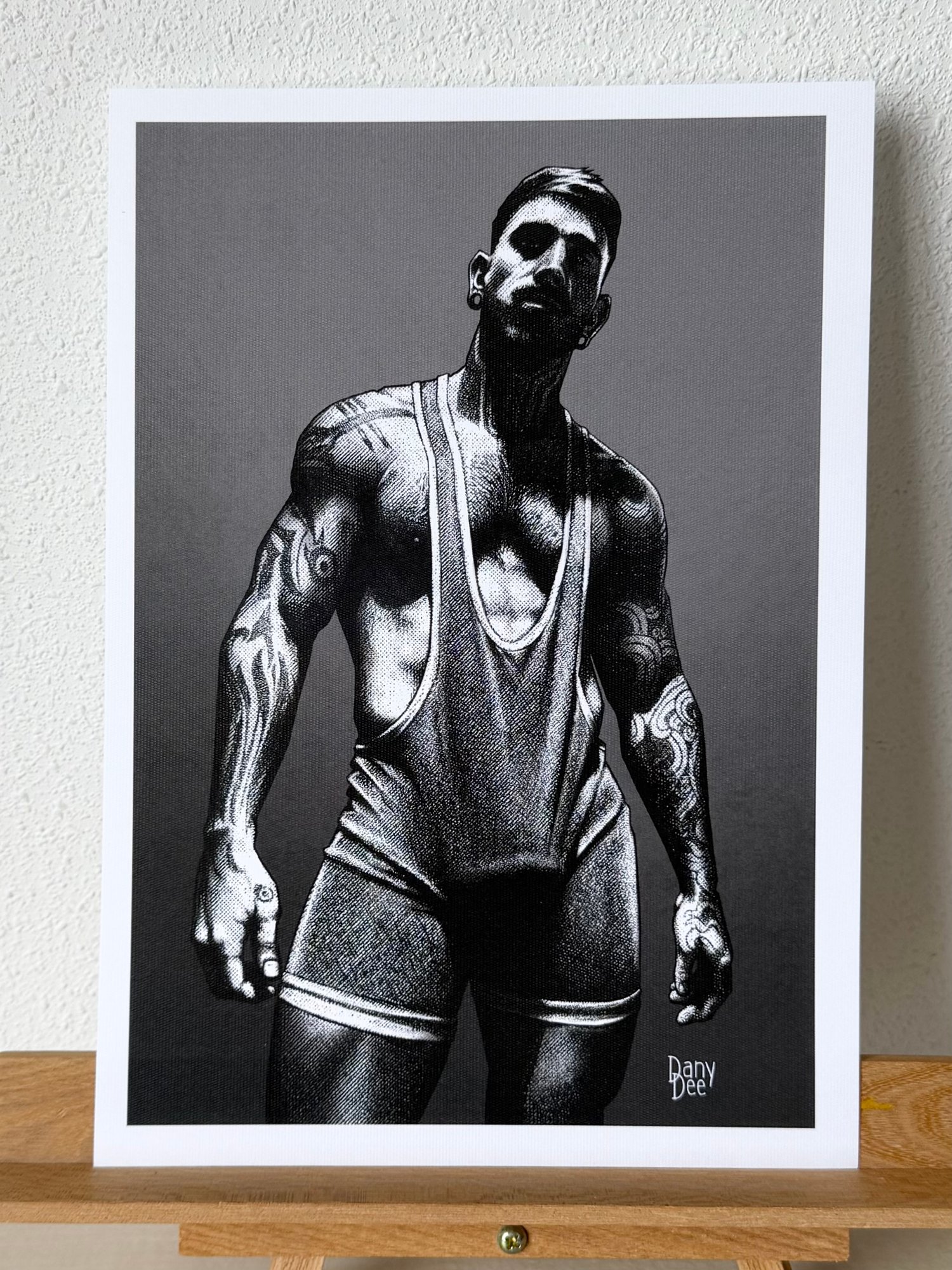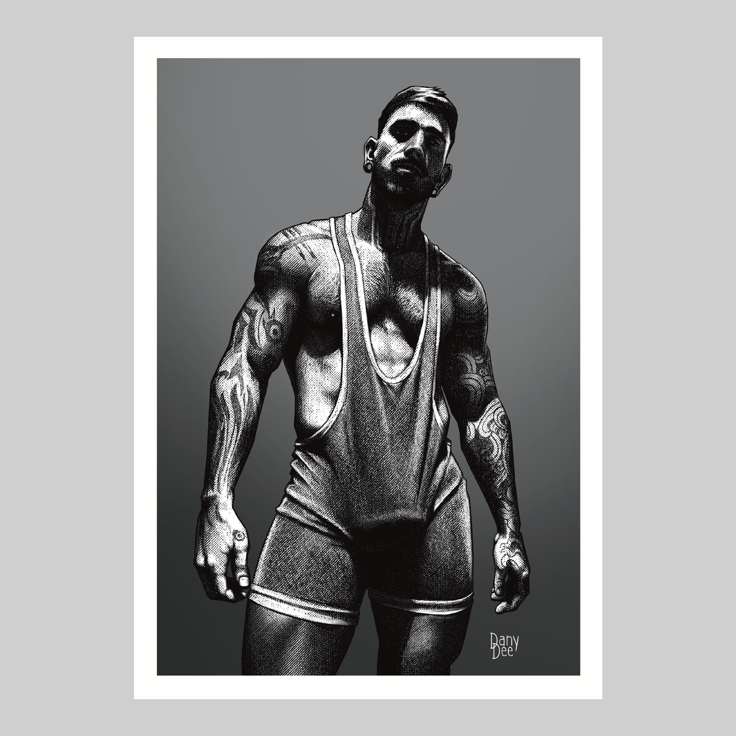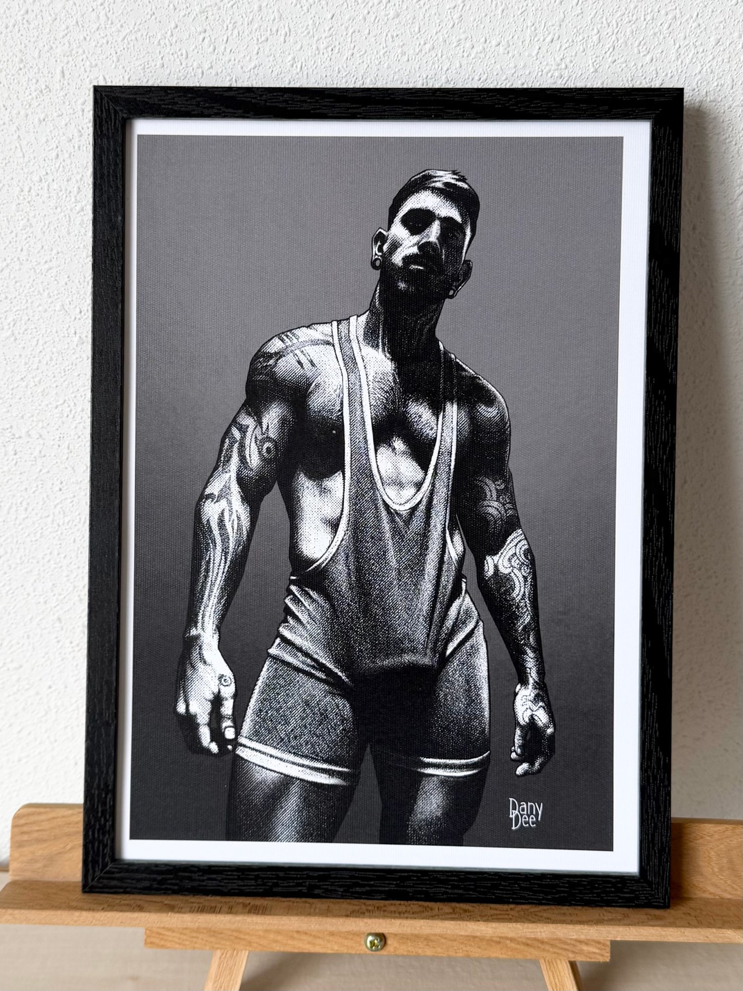 "The Strength" is a hand-drawn, monochromatic A4 art print celebrating raw masculine beauty — a bold homoerotic illustration of a heavily tattooed, powerfully built man in a wrestling singlet, gazing upward with quiet intensity, perfect for gay art collectors or queer home decor.