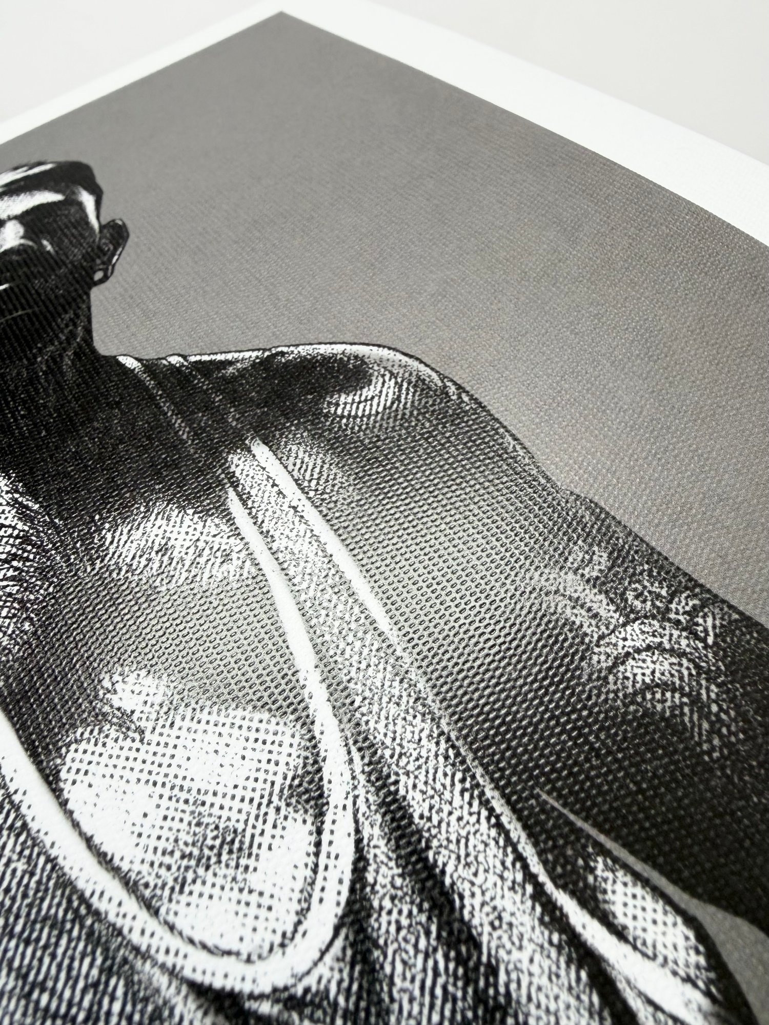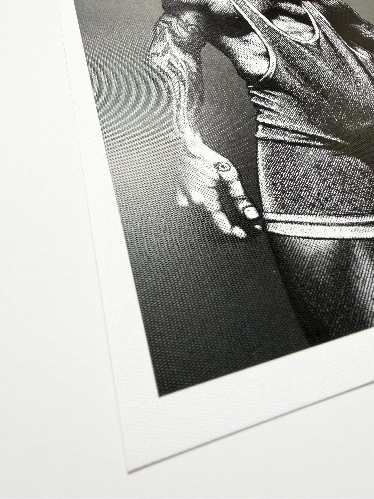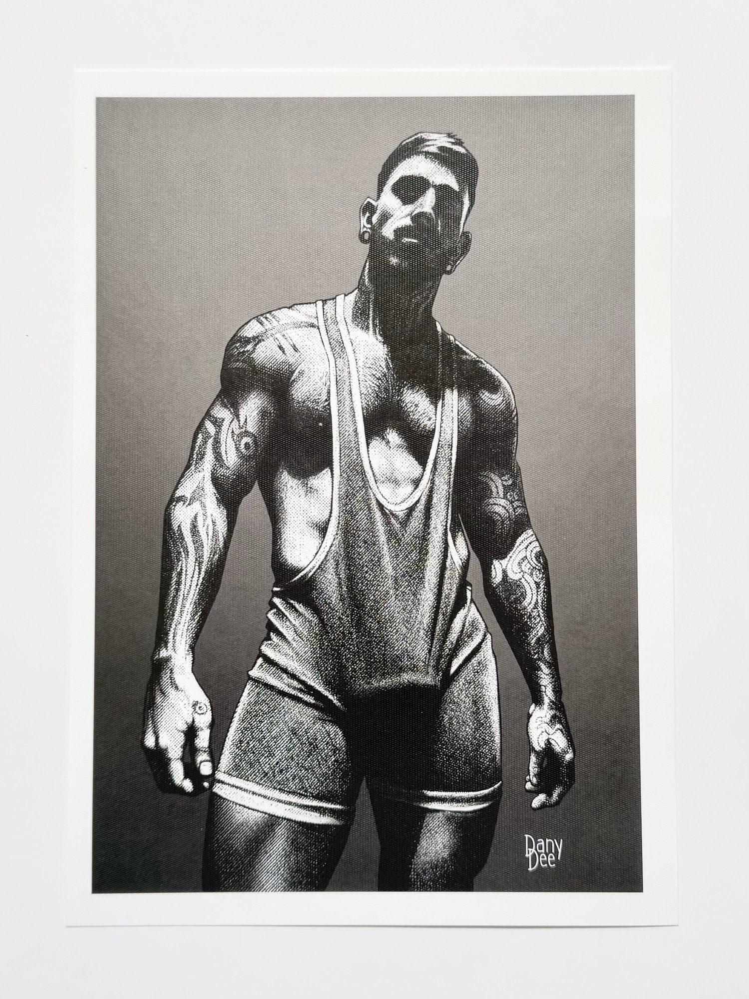 "The Strength" is a hand-drawn, monochromatic A4 art print celebrating raw masculine beauty — a bold homoerotic illustration of a heavily tattooed, powerfully built man in a wrestling singlet, gazing upward with quiet intensity, perfect for gay art collectors or queer home decor.