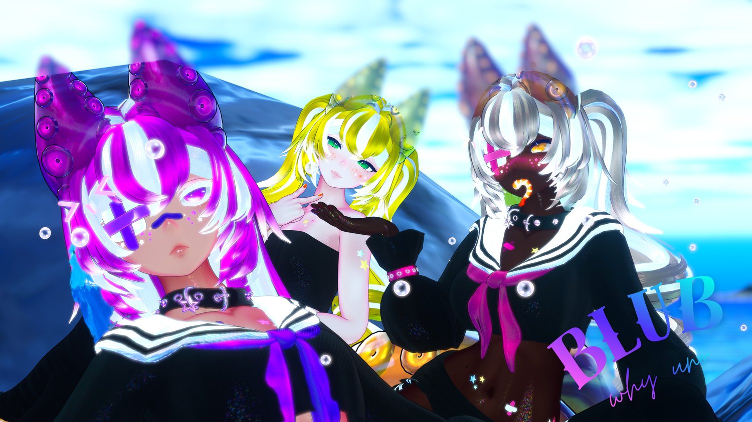 Head / Body / Eye Textures / Pigtails & Long Hair / Short Hair / Hair Textures / Octopus Set / Parrot (randomizer/follower system made by me) / Sweater, Scarf & Turtleneck / Body Stars (edited by me) / Shrimp / Bandaids (edited by me) / Sneakers (nitro) / Skirt, Shirt, Fishnets, Underwear, Tube top, Socks & Warmers / Matcaps 1 / Matcaps 2 / Hair Matcap / Bubbles / Face Stars (edited by me) / GogoLoco / Earrings / Collar / Jeans / Text & Emoticon (and most masks) made by me! :3