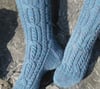 The recommended yarn creates a casual sock with clear stitch definition. The pattern includes detailed instructions and cable charts. These socks are worked from the top down.