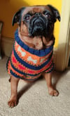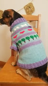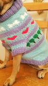 The construction of this sweater is top down, in the round with chest increases made using M1L/R increases. The armholes are knit onto scrap yarn and then the sleeves are later picked up and knit in the round. The tummy shaping is done with simple decreases, there is also an optional harness hole. The stranded colourwork in this design is really fun, highlighting some of our furry friends favourite things, including bones, hearts for love and of course, trees!