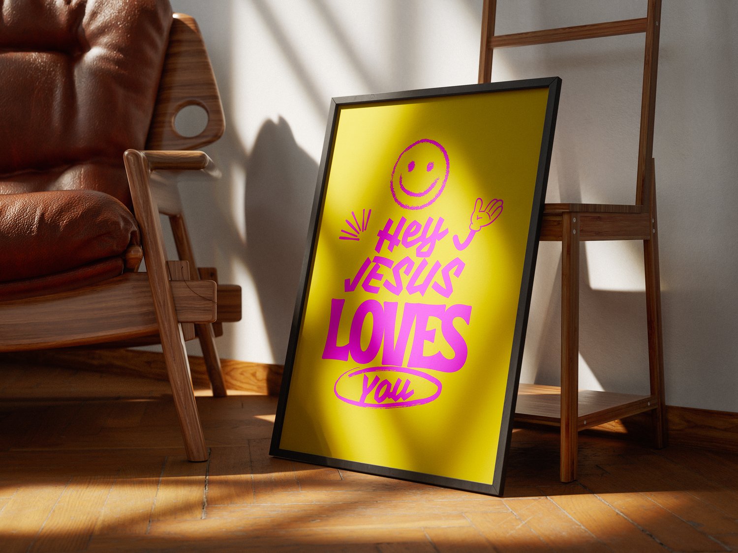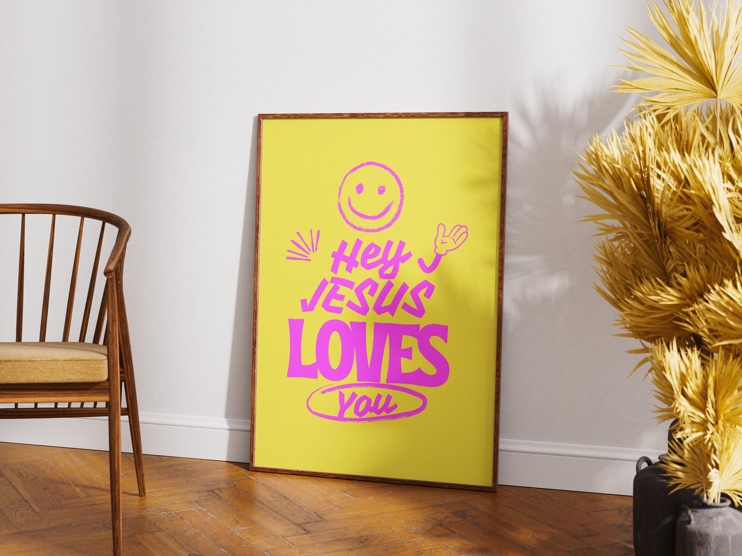 Featuring hand-drawn elements like a smiling face, a waving hand, and playful typography, this design spreads the timeless message: "Hey, Jesus Loves You" — loud and clear.
