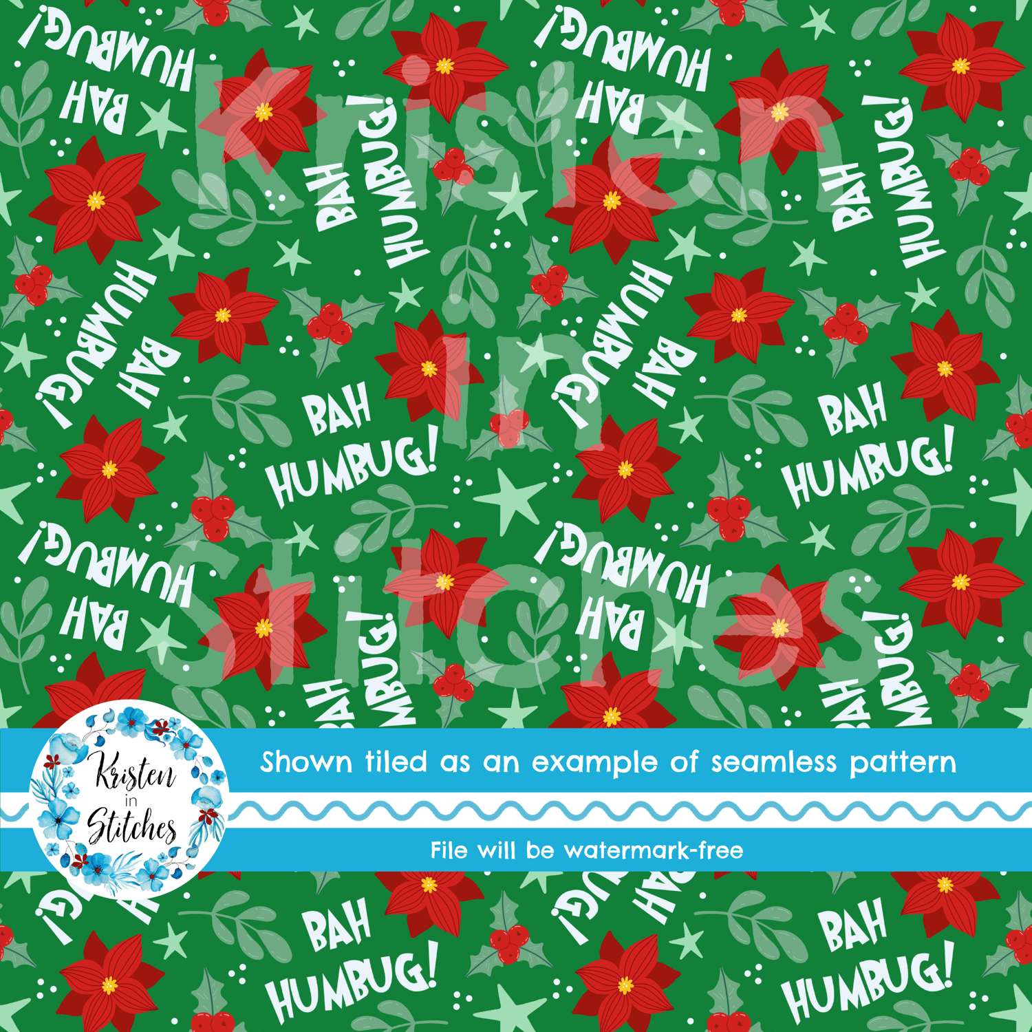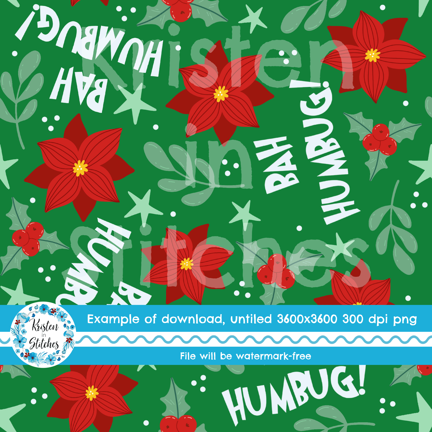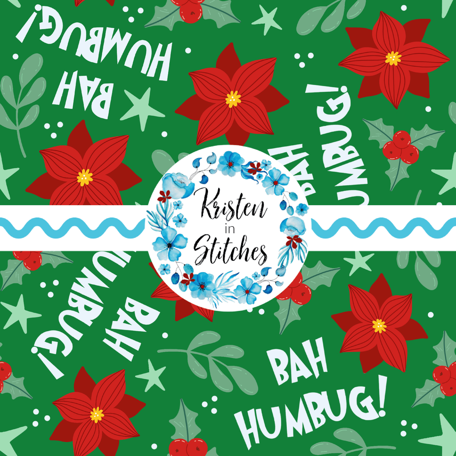 Bah Humbug! lettering with red Christmas poinsettia flowers, holly and berries and winter greenery on green.