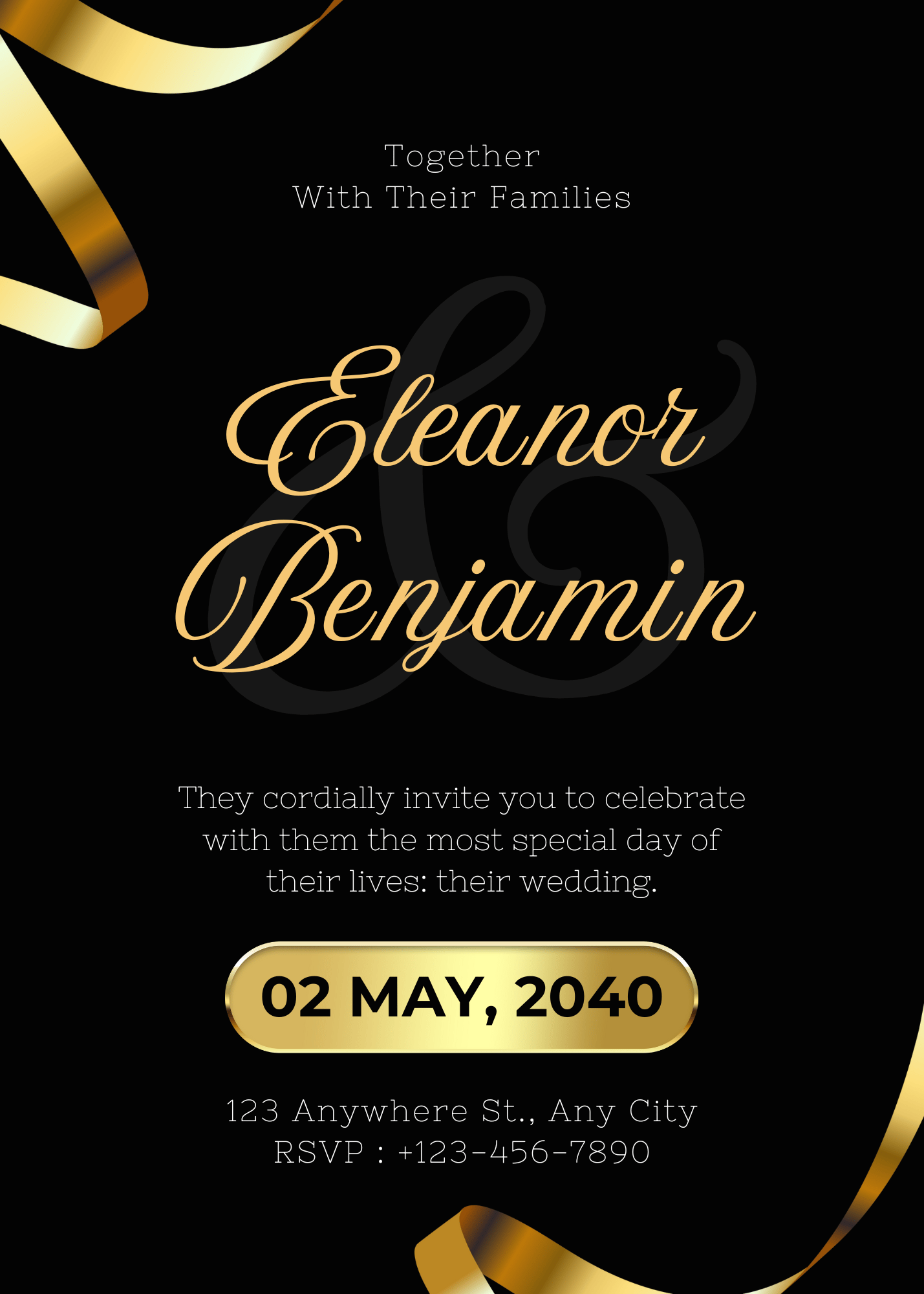 Perfect for a glamorous or black-tie affair, this bold Canva template features dramatic black with metallic gold elements and modern layout.
