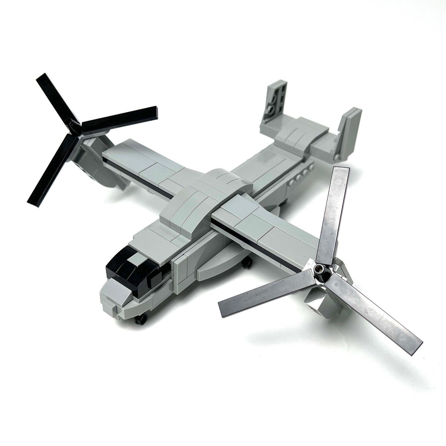Our brick built version is made in roughly 1:90 scale and is compatible and playable with nano soldiers, and you can fit a few inside the body of the aircraft. The two main rotor blades do spin and it can tilt to simulate forward thrust or vertical lift off. There's also a working back door that can open.
