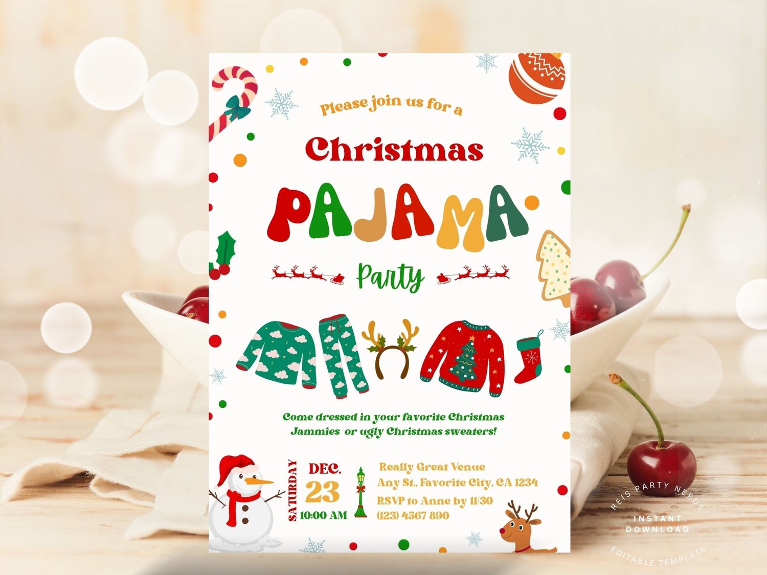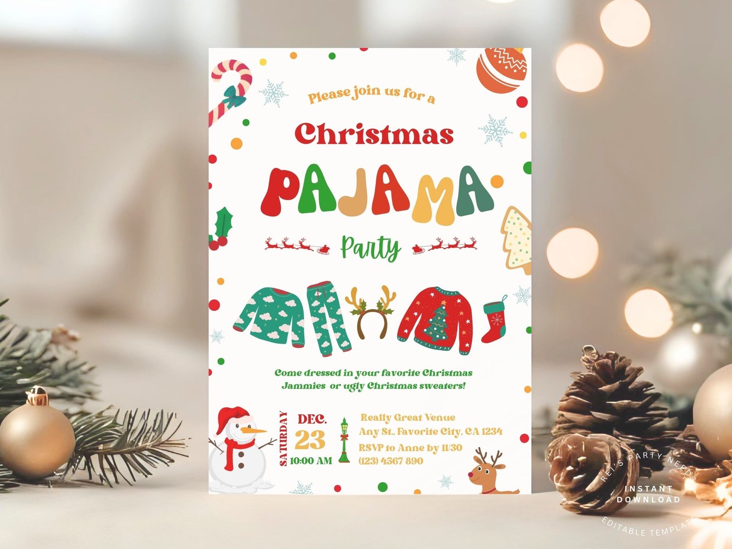 Editable Christmas Pajama Party Invitation, Christmas Invitation, Christmas Sleepover Invitation, Christmas Pajama Party Birthday Invitation