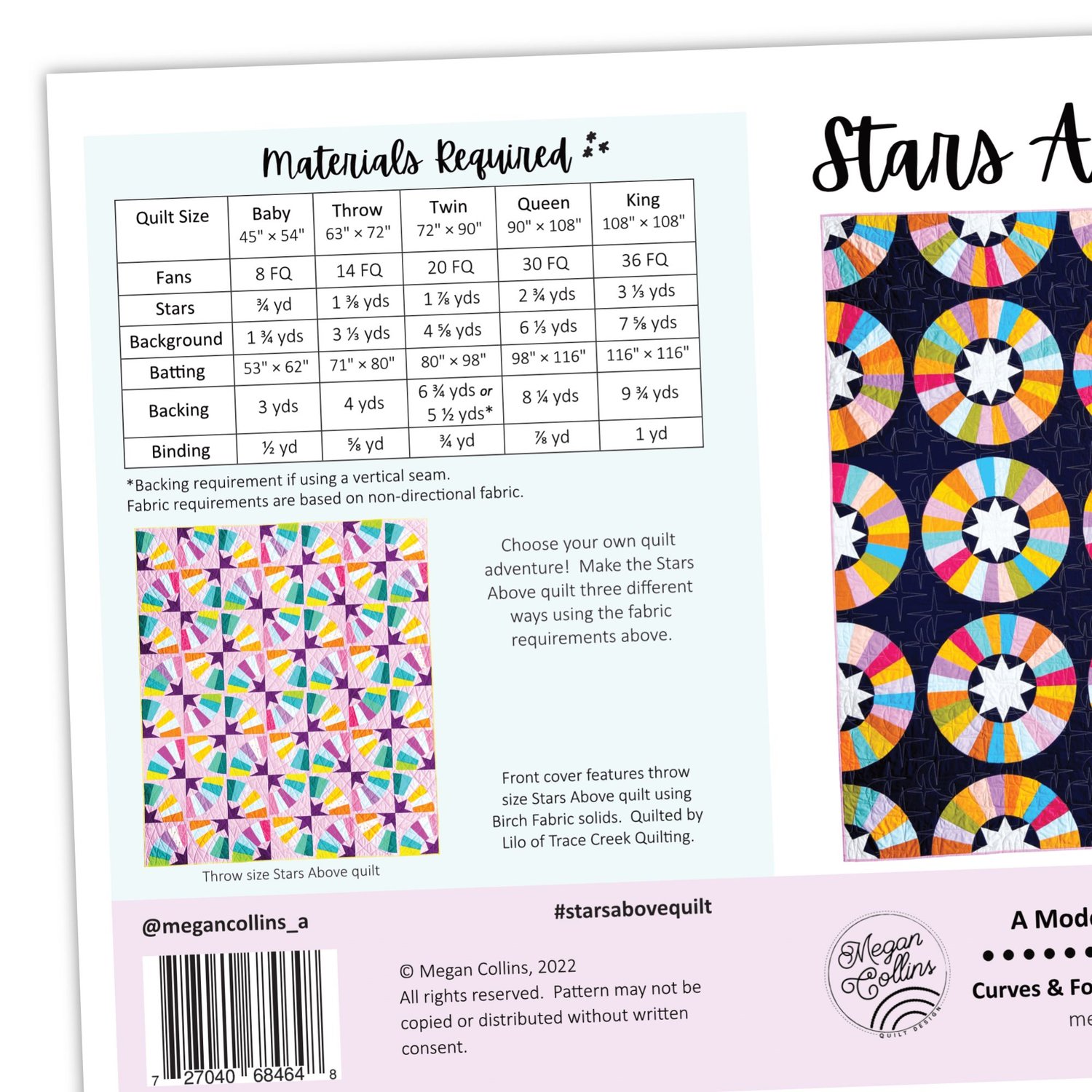 Stars Above is a sparkly modern traditional quilt. The pattern uses beginner level foundation paper piecing and intermediate level curve piecing. The pattern includes charts and clearly illustrated step-by-step instructions for making baby-king size quilts.