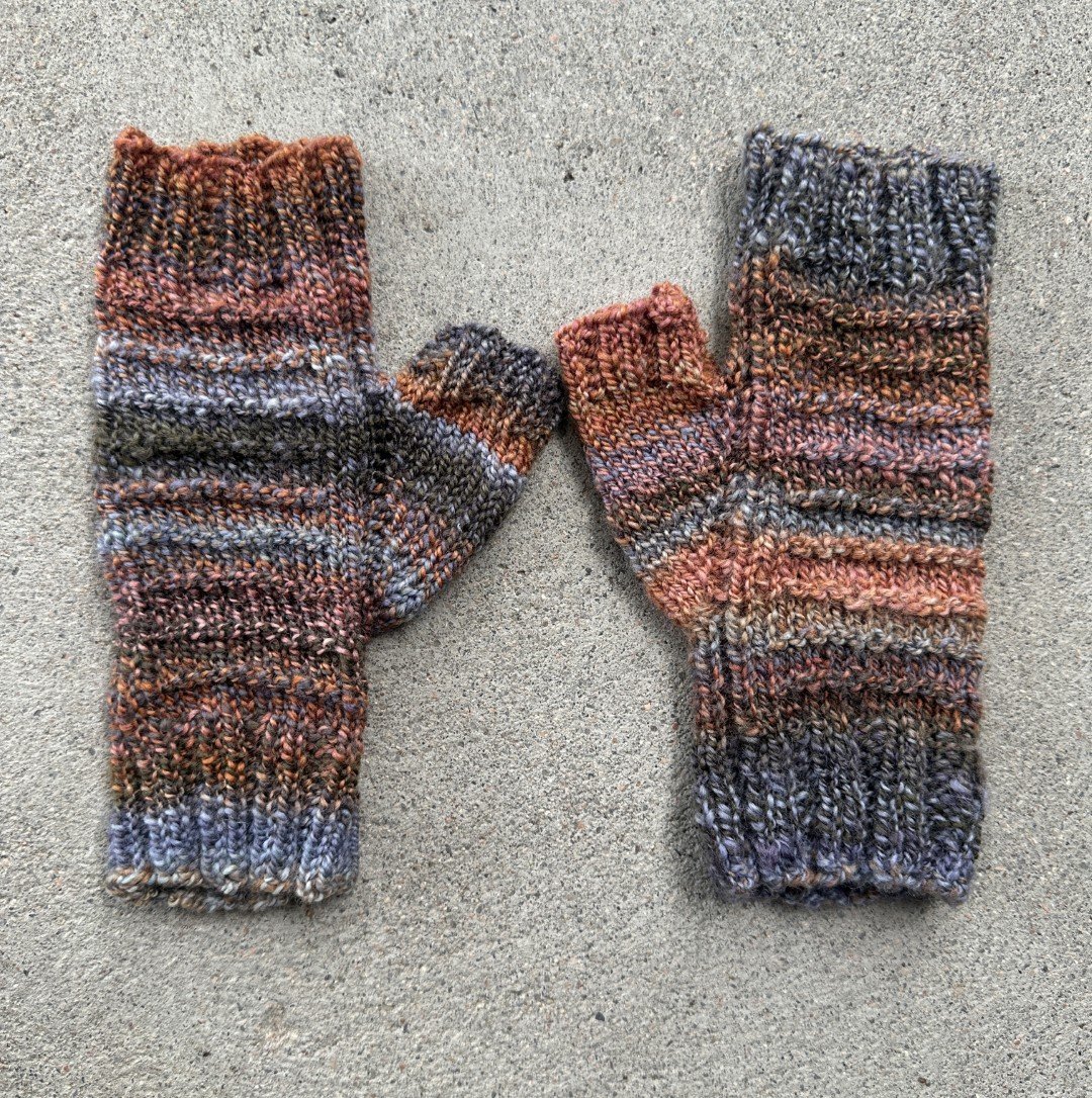 In addition to knitting and designing patterns, handspinning has found a place in my crafty endeavors. Often, I’m drawn to a colorway or fiber and spin just 1 skein. As I add special single skeins to my stash, I am working on adding special single skein designs to my knitwear design portfolio. Enter SMALL POTATOES FINGERLESS MITTS! This accessory is designed with DK weight handspun yarn in mind. A ribbed and textured pattern accommodates variation in yarn weight, and the circumference shows off color shifts beautifully. If you take care when weaving in your ends, these fingerless mitts are totally reversible. Wear them inside out and on either hand. Directions are provided for both right and left mitts to mirror the textured panel.
