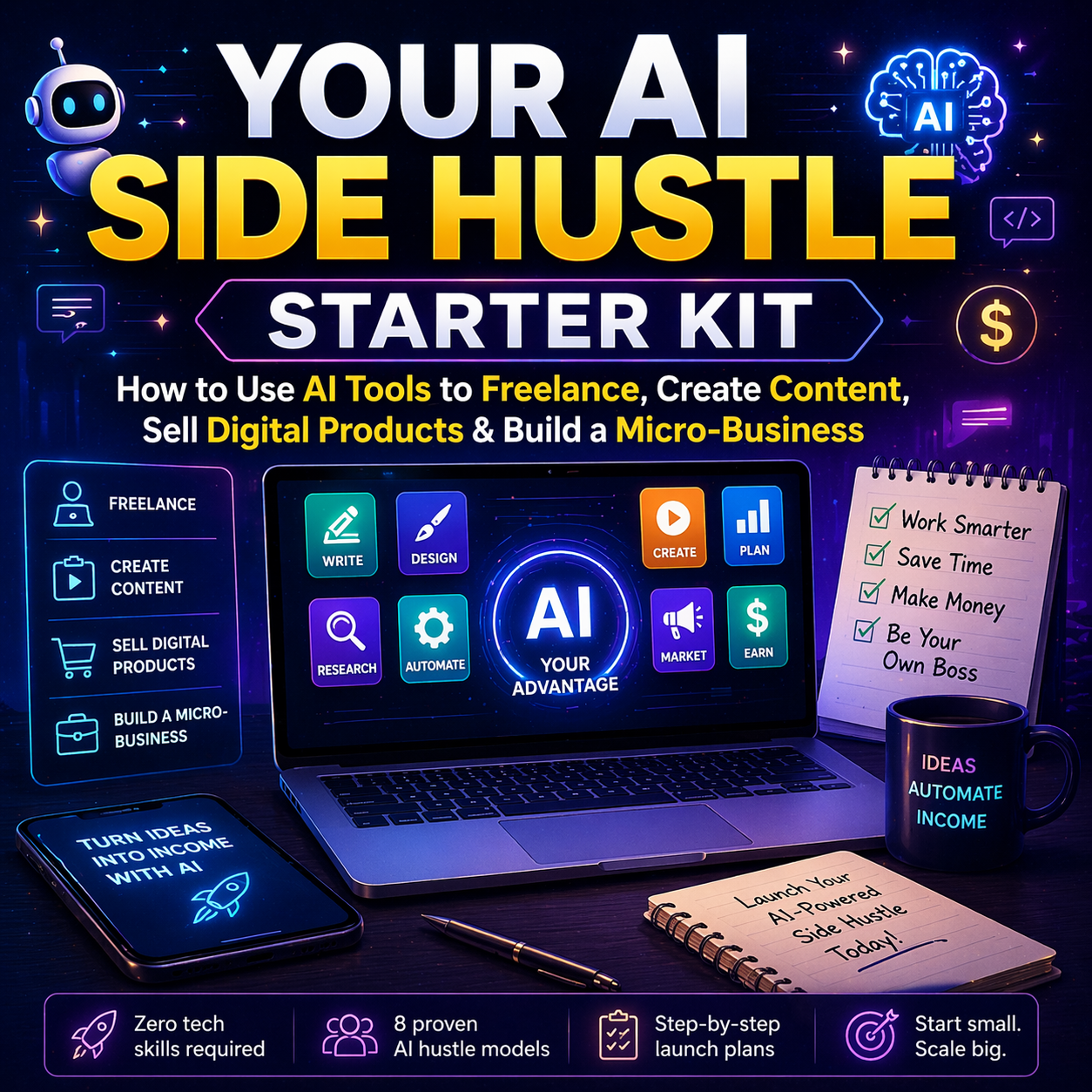 YOUR AI SIDE HUSTLE STARTER KIT is a practical, no-fluff guide designed to help beginners tap into the power of AI and build real income streams—without coding, tech skills, or expensive tools.