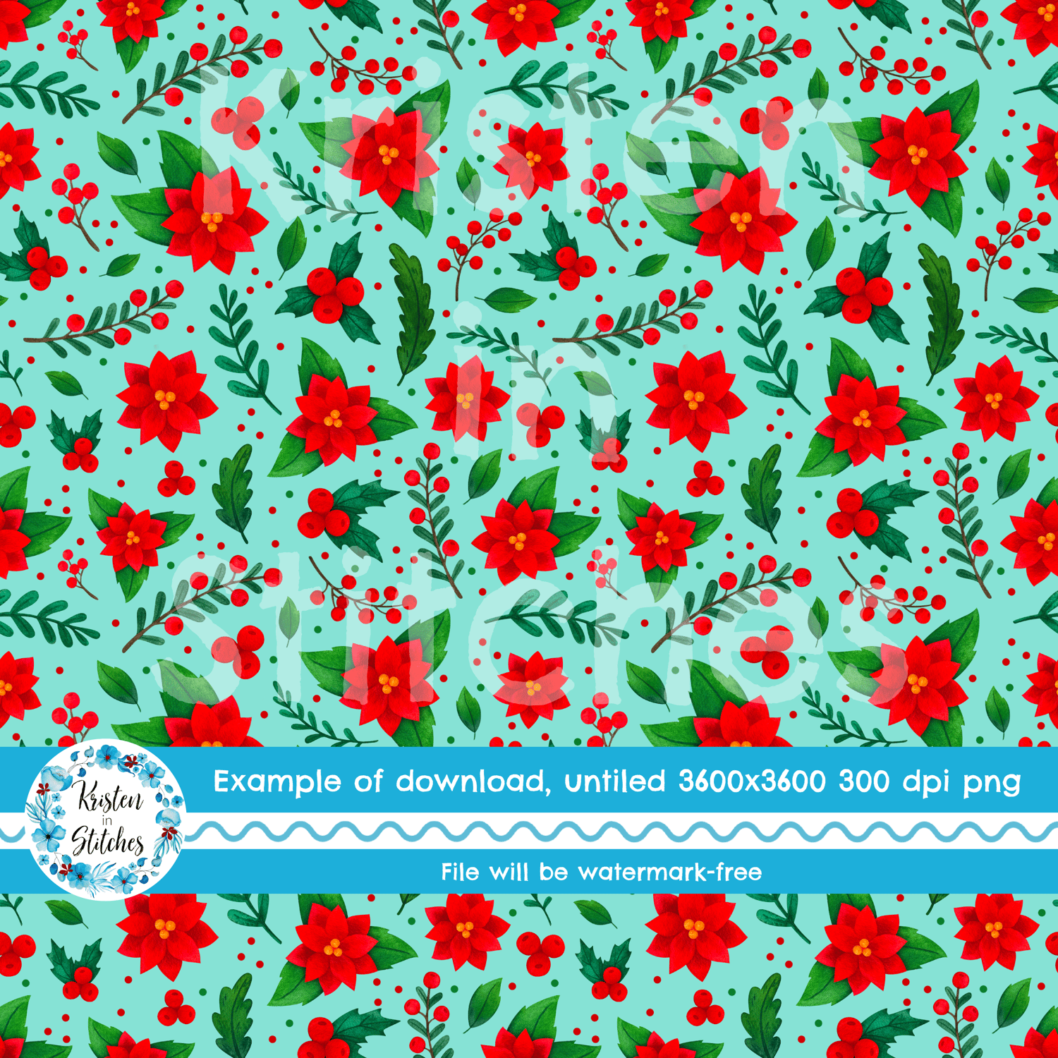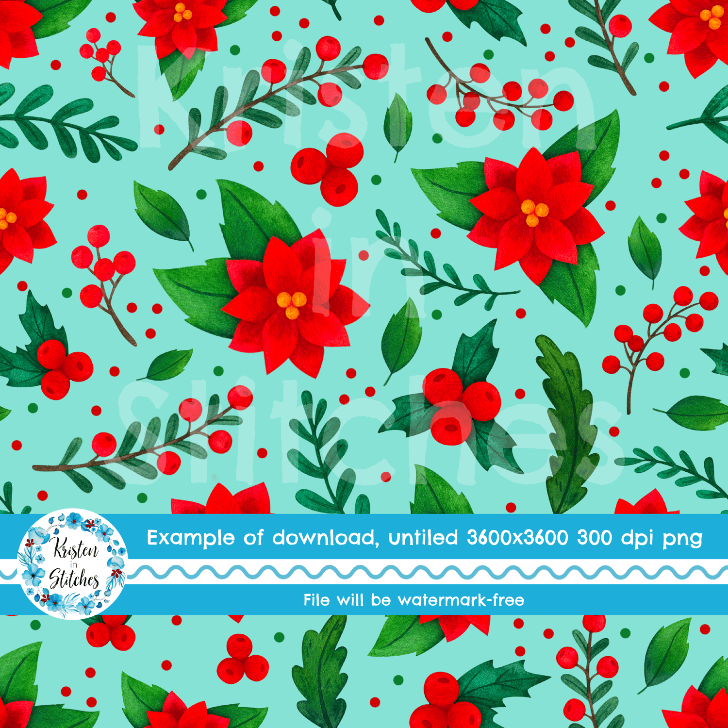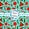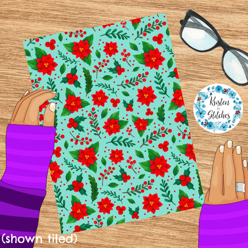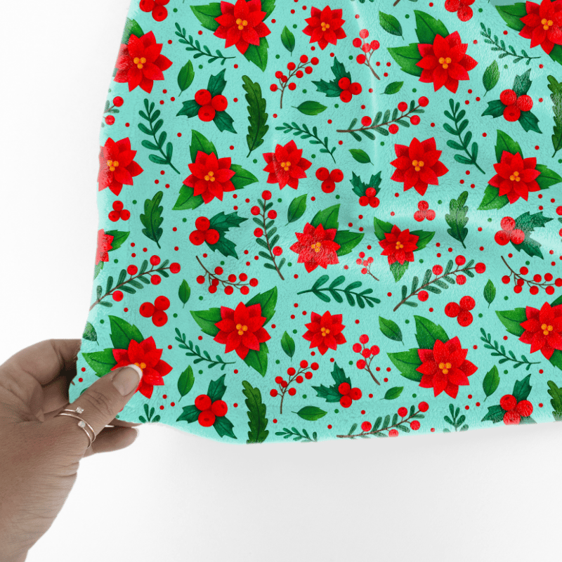 Pretty red poinsettia flowers, holly and berries and winter greenery on blue.
