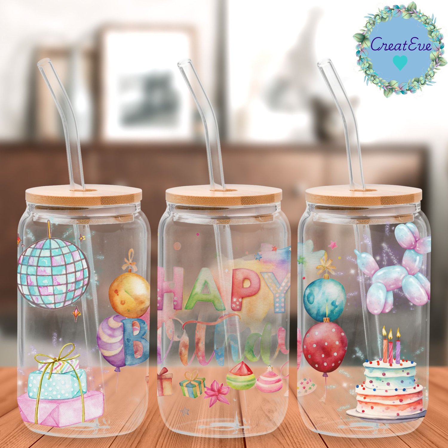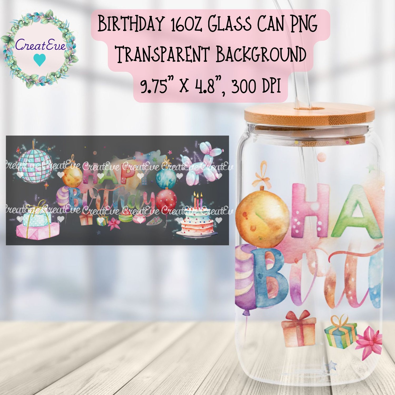 Birthday 16oz Glass Can PNG, 300dpi, 9.75" x 4.8"