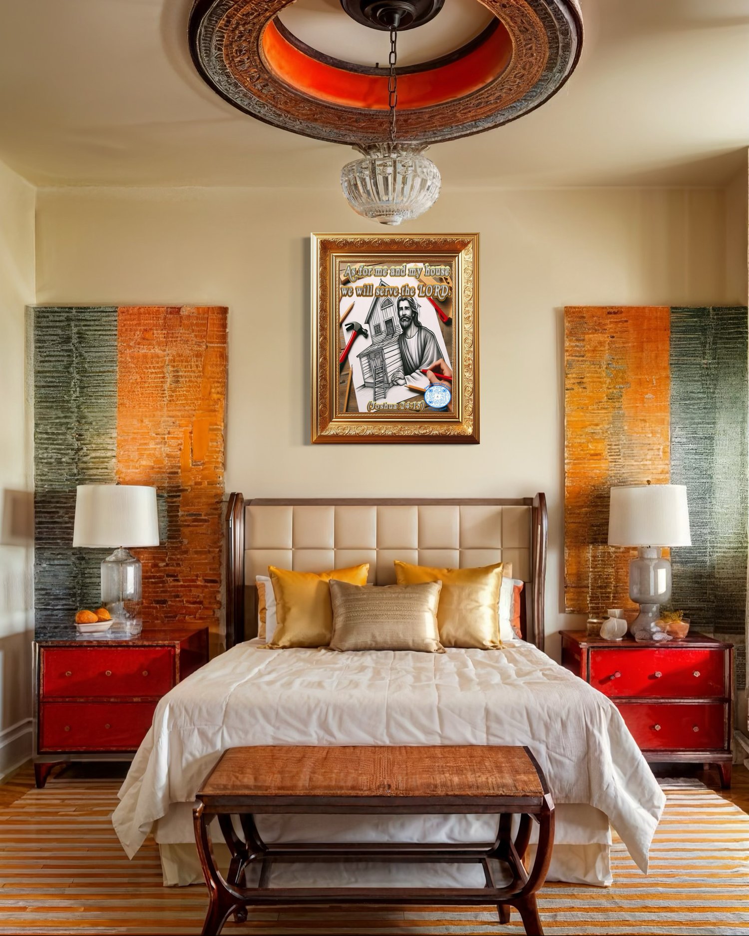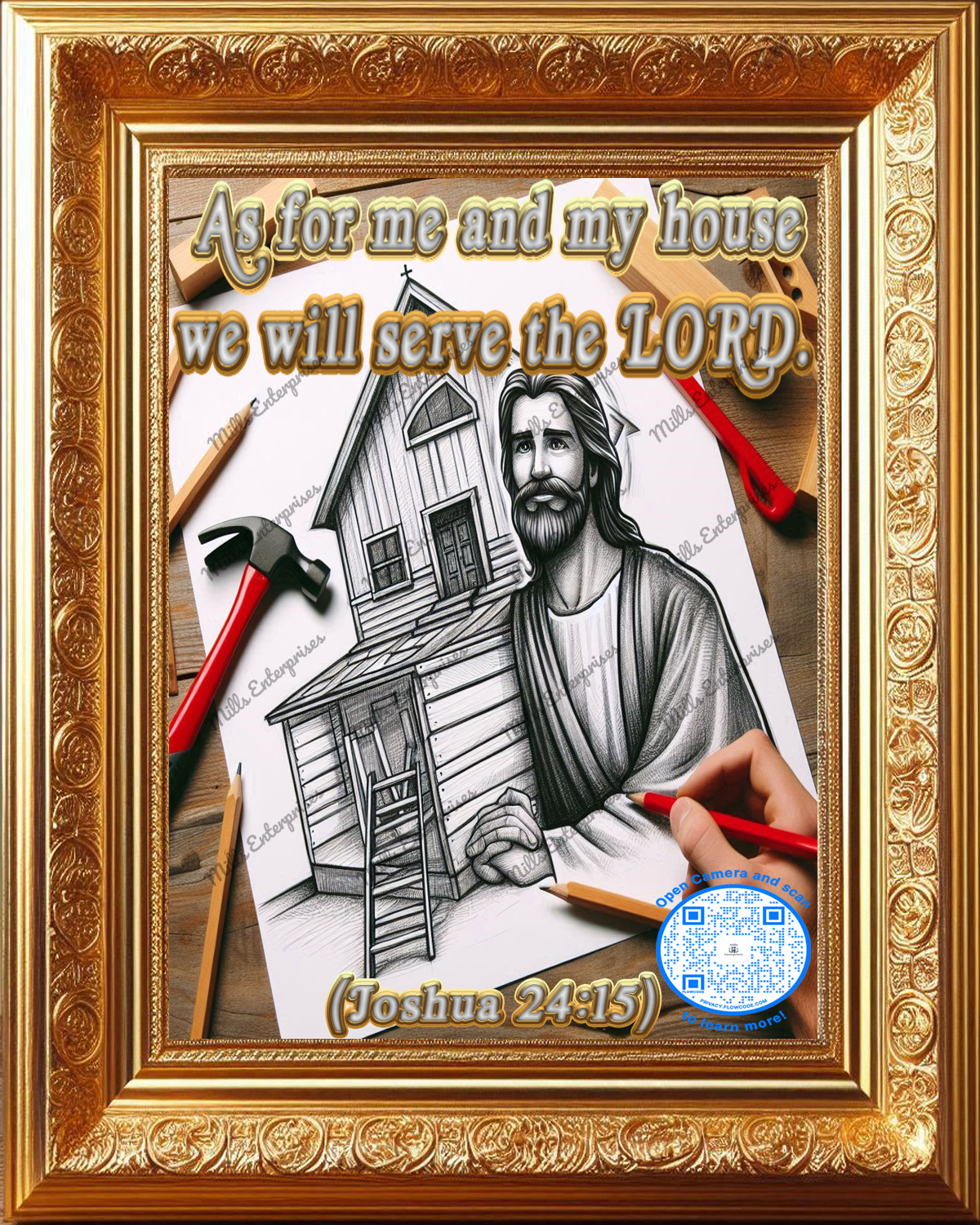 Joshua 24:15 is a significant verse from the Bible that emphasizes the importance of choice and commitment in faith. In this verse, Joshua, the leader of the Israelites, addresses the people as they settle in the Promised Land. He challenges them to decide whom they will serve, whether the gods their ancestors worshiped or the Lord. Joshua’s leadership is evident as he encourages the Israelites to reflect on their past and make a conscious choice about their future. Worship the Lord as Joshua did and use this artwork to remind you that God gives us free will to choose and make our own decisions. Keep this artwork in your house to remind you that when you are weak God is at his strongest and he will protect you and all who dwell in your home! Jesus is a carpenter because he builds people up!