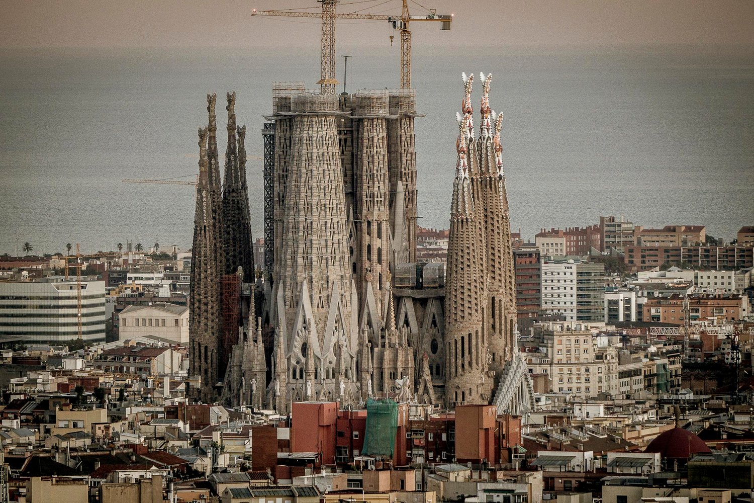 Aerial view of Barcelona with the Sagrada Família temple as its main motif, still under construction and probably for a few more years