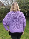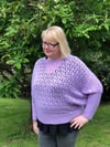 Loose fitting sweater with an all over lace pattern. The sweater is worked in the round to the underarms. Front and back are then worked flat to the shoulders. Stitches are picked up for the ribbed sleeves which can be adjusted in length. Largest size is modelled with 14cm ease at hip.