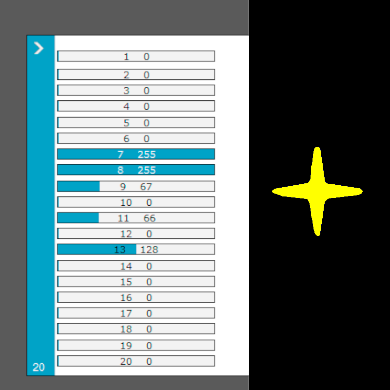 * Verifique que coincidan estos canales: 8 Dimmer, 7 Strobo / Shutter, 9 en el valor 67 = Color Amarillo, 11 en el valor 66 = Gobo de Cruz, 13 foco (ver tercer foto).