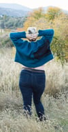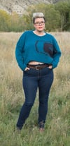 The Raven Pullover is an oversized, boxy cropped sweater with drop shoulders and an intarsia pattern on the front and back. The body is knit flat and seamed, the sleeves are picked up at the shoulder and knit in the round.
