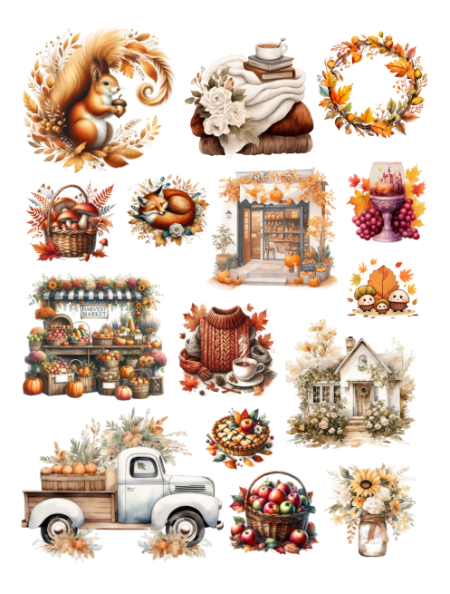 Pull out your scissors and glue and dive into the magical world of delightful autumn ephemera including squirrels, fall leaves, home scenes, people, coffee, candles, grapes, pumpkins, flowers, books, suitcases, cars, nature scenes, sweaters, scarves, mushrooms and much more with this artistically beautiful clip art cut and collage book.