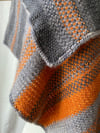 It starts with a border where all three stitch variations come into play, the middle part is knitted in a two-color linen stitch and so the grey and silver flow into each other and become one. Finally, the orange appears again to create a harmonious connection with the initial border.