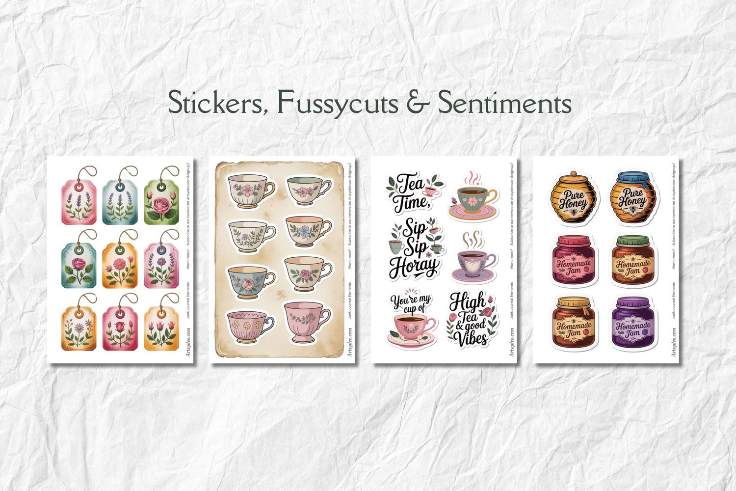 Print at home, trim, and tuck into your junk journals, scrapbooks, planners, or traveler's notebooks. They resize beautifully for smaller formats too.