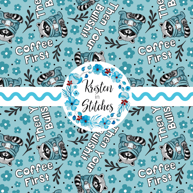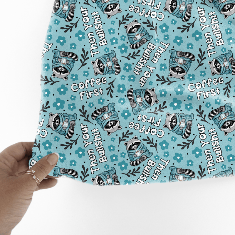 Coffee First, then your Bullshit Sweary Raccoons on Blue.