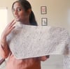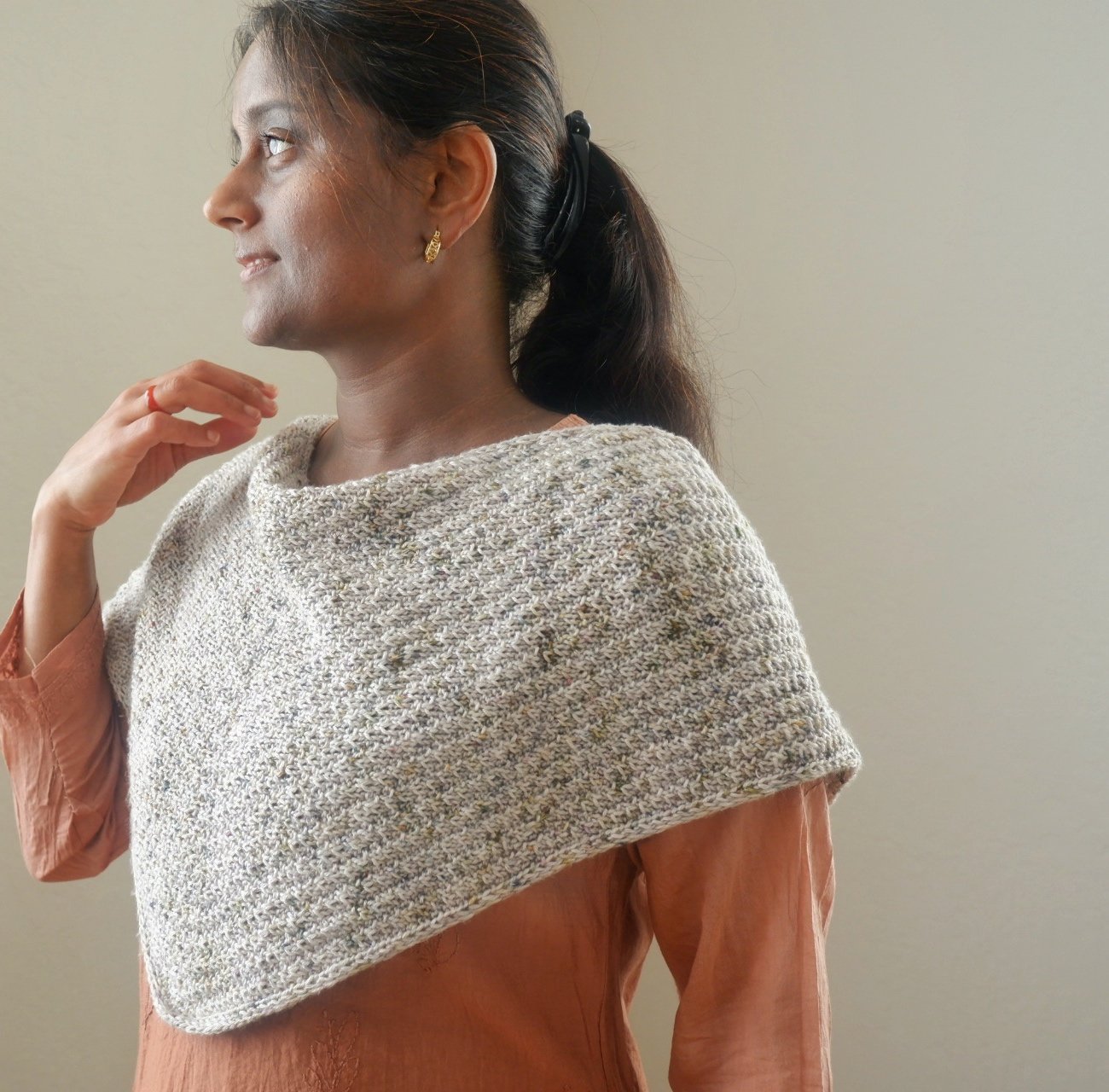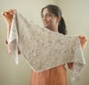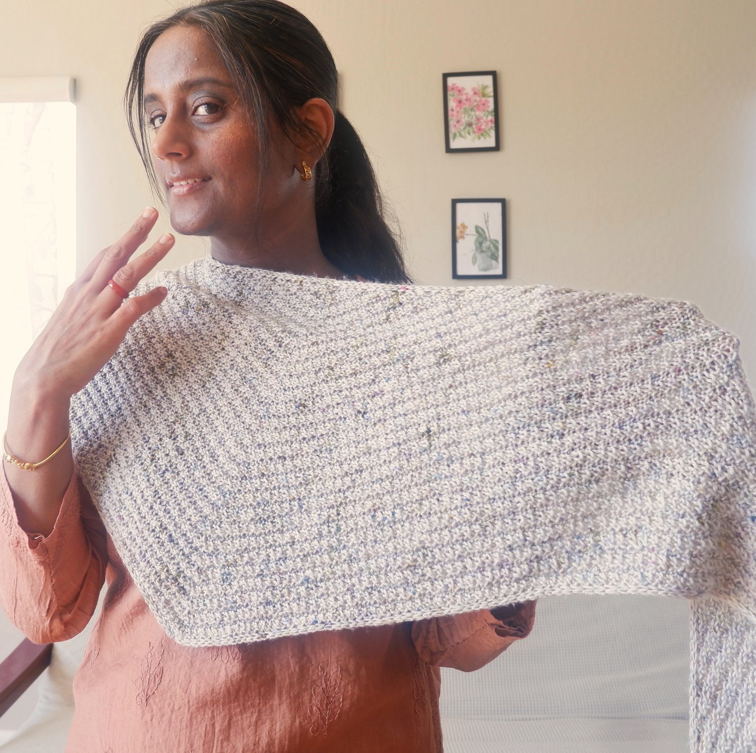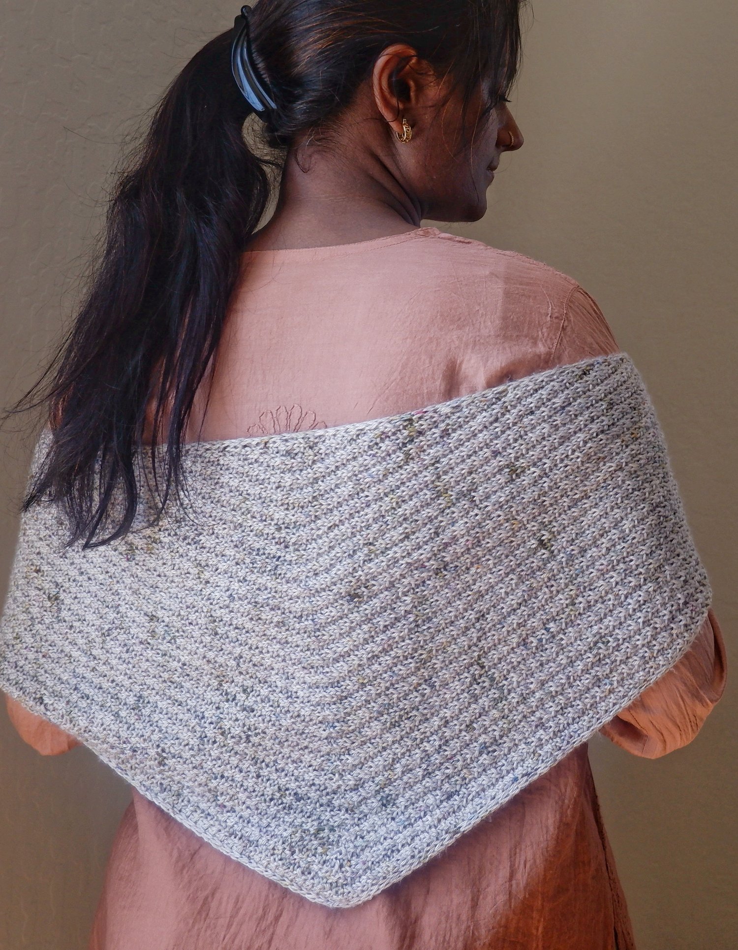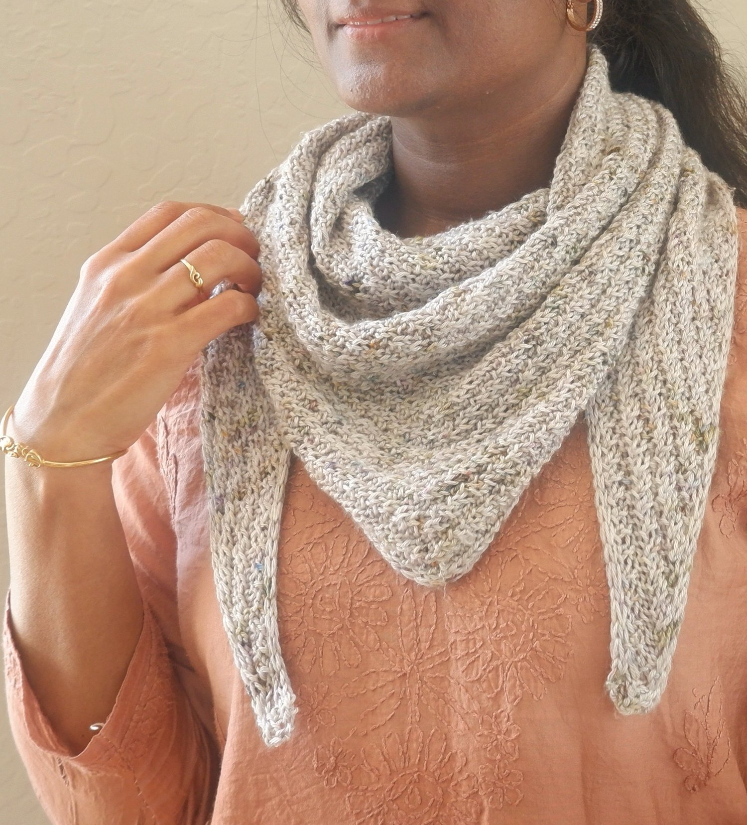 I used one skein of fingering-weight yarn to knit this textured shallow triangular scarf/shawl. But the pattern is easily adaptable to different yarn weights, and the size can be adjusted to suit your preference. Helpful notes are included in the pattern.