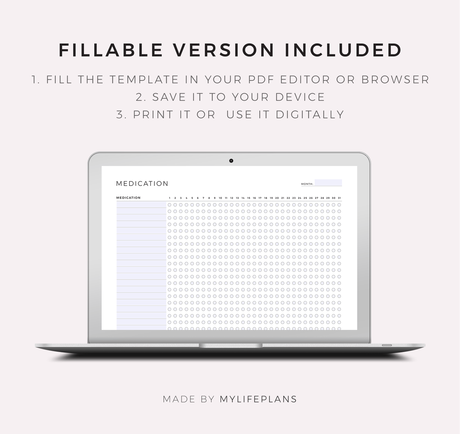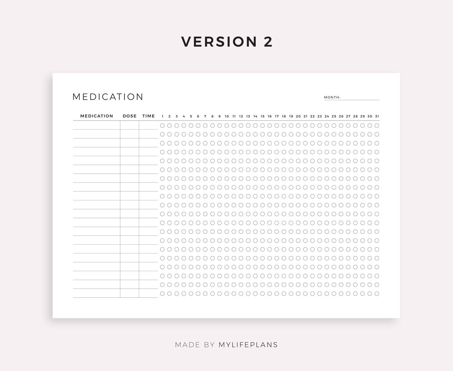 This is a printable monthly medication tracker — just download, print, and start using it right away.