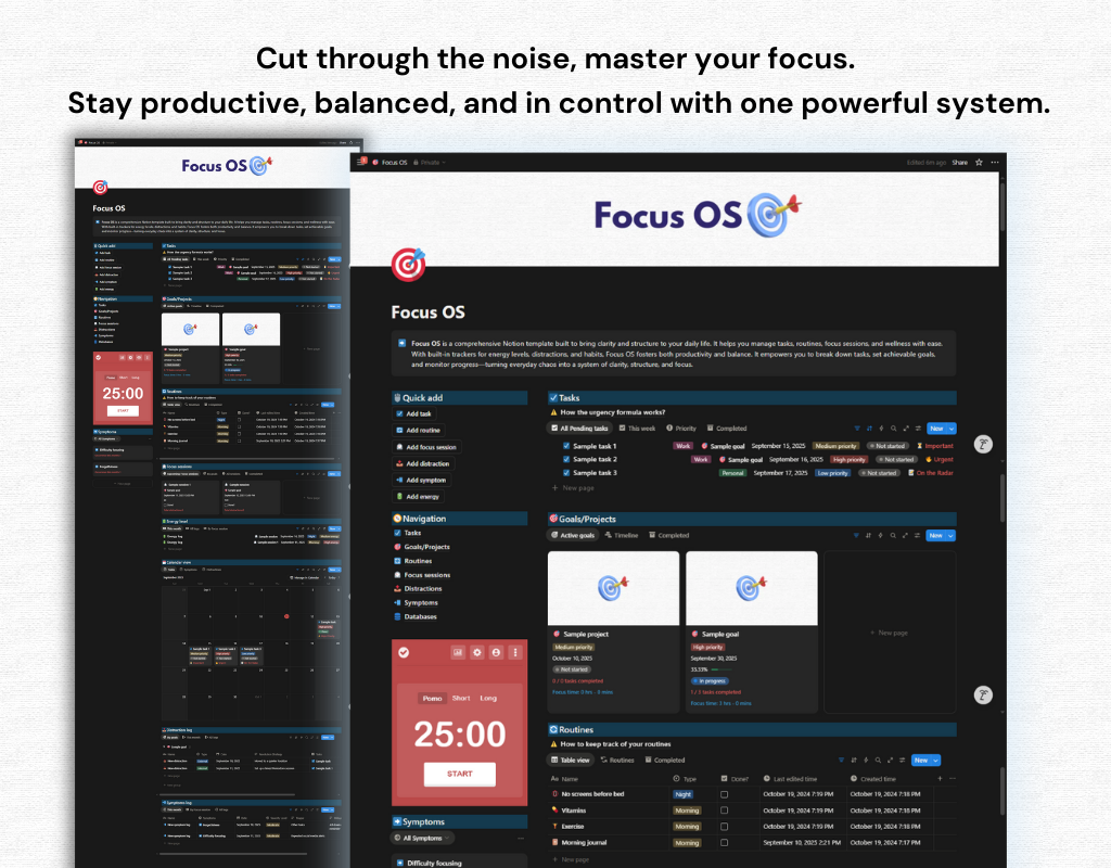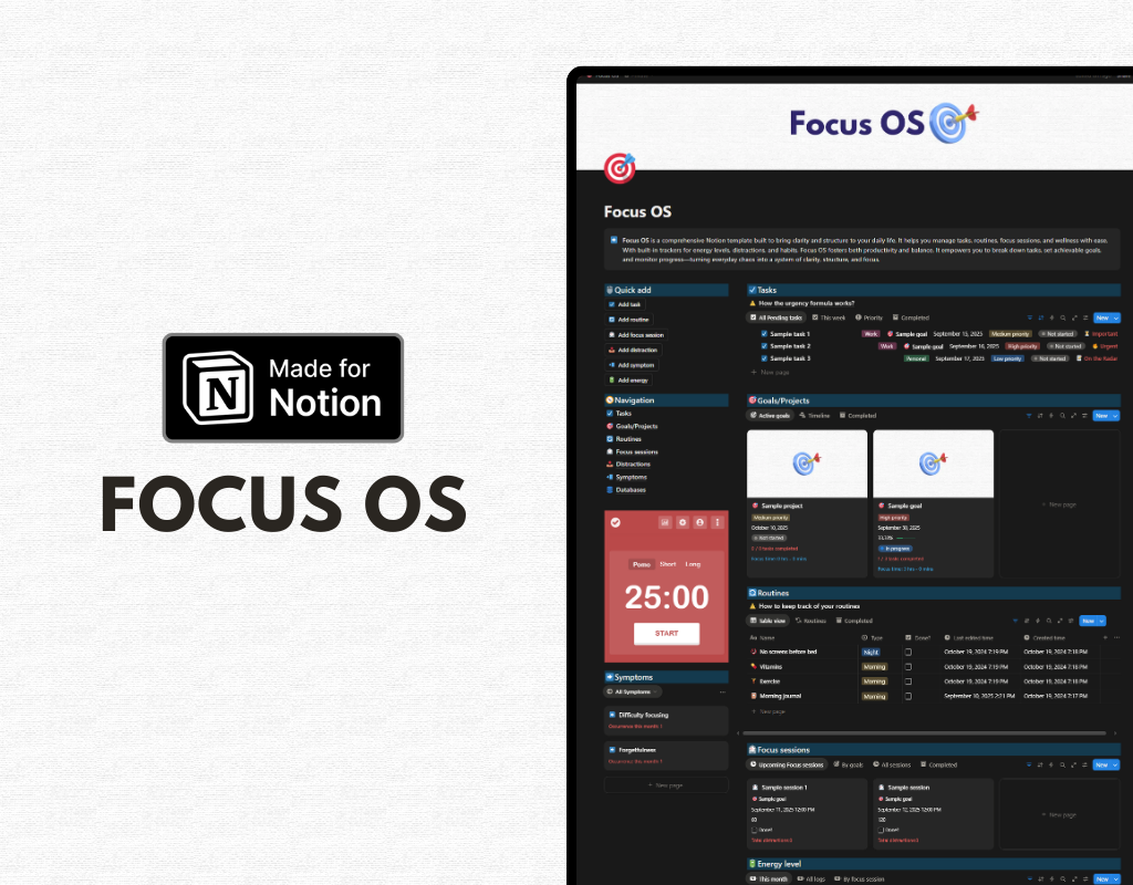 Focus OS is your all-in-one system for clarity, structure, and balance. Designed in Notion, it helps you move from scattered thoughts to focused action with tools that connect goals, habits, and daily energy.