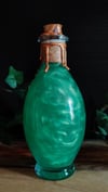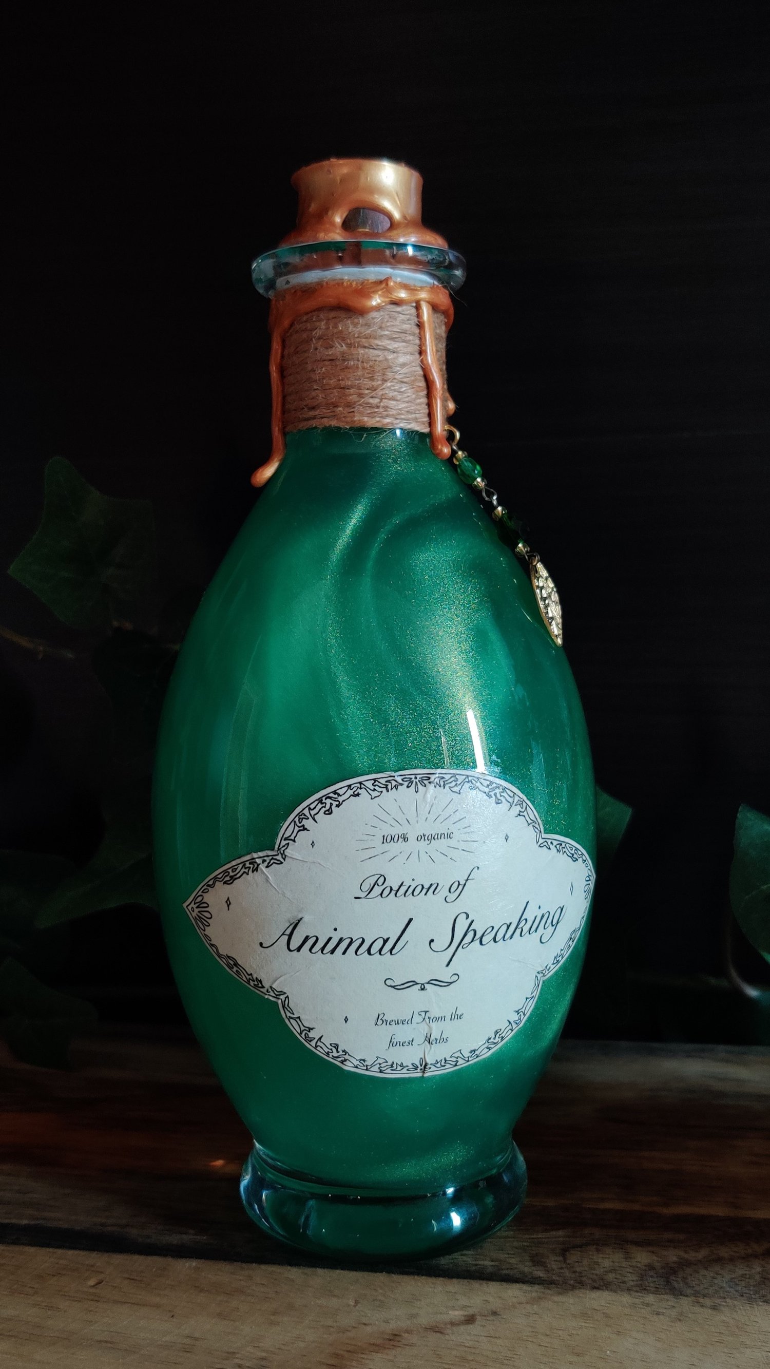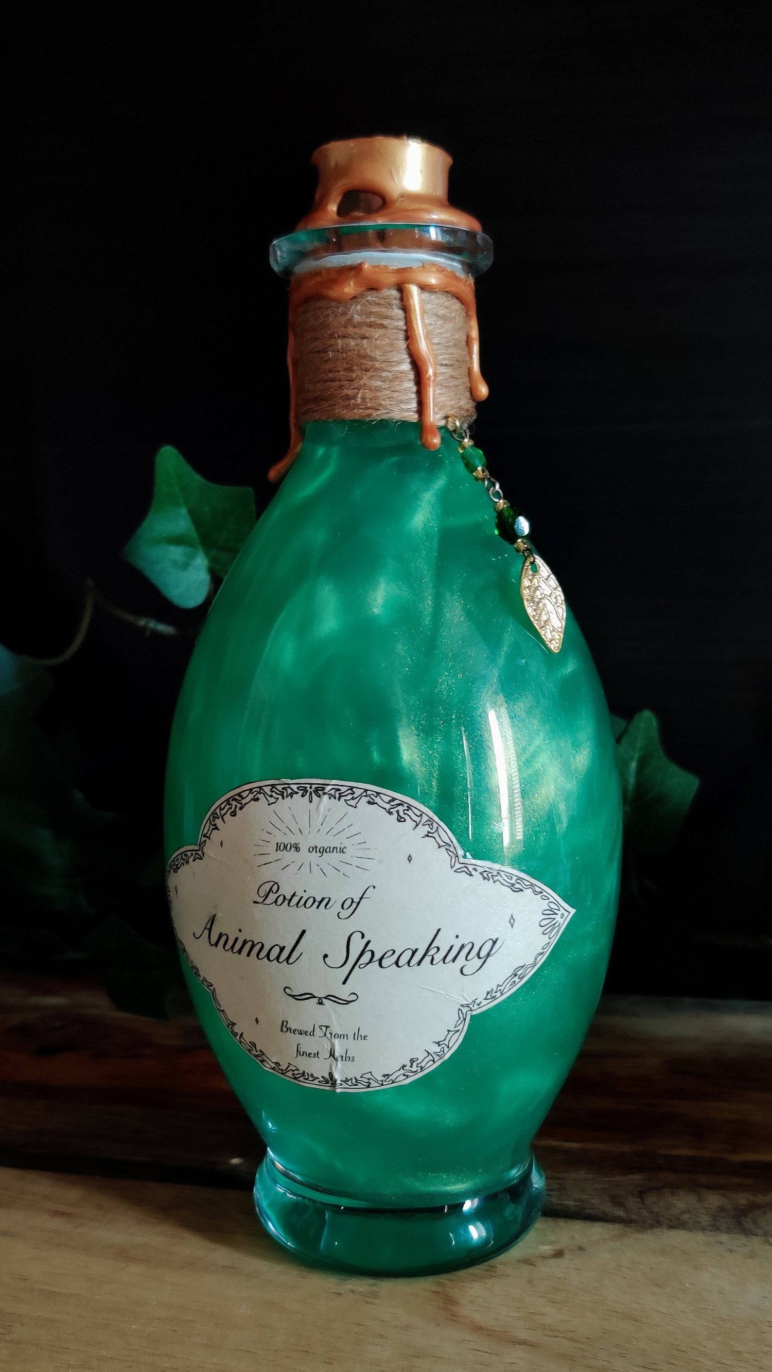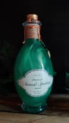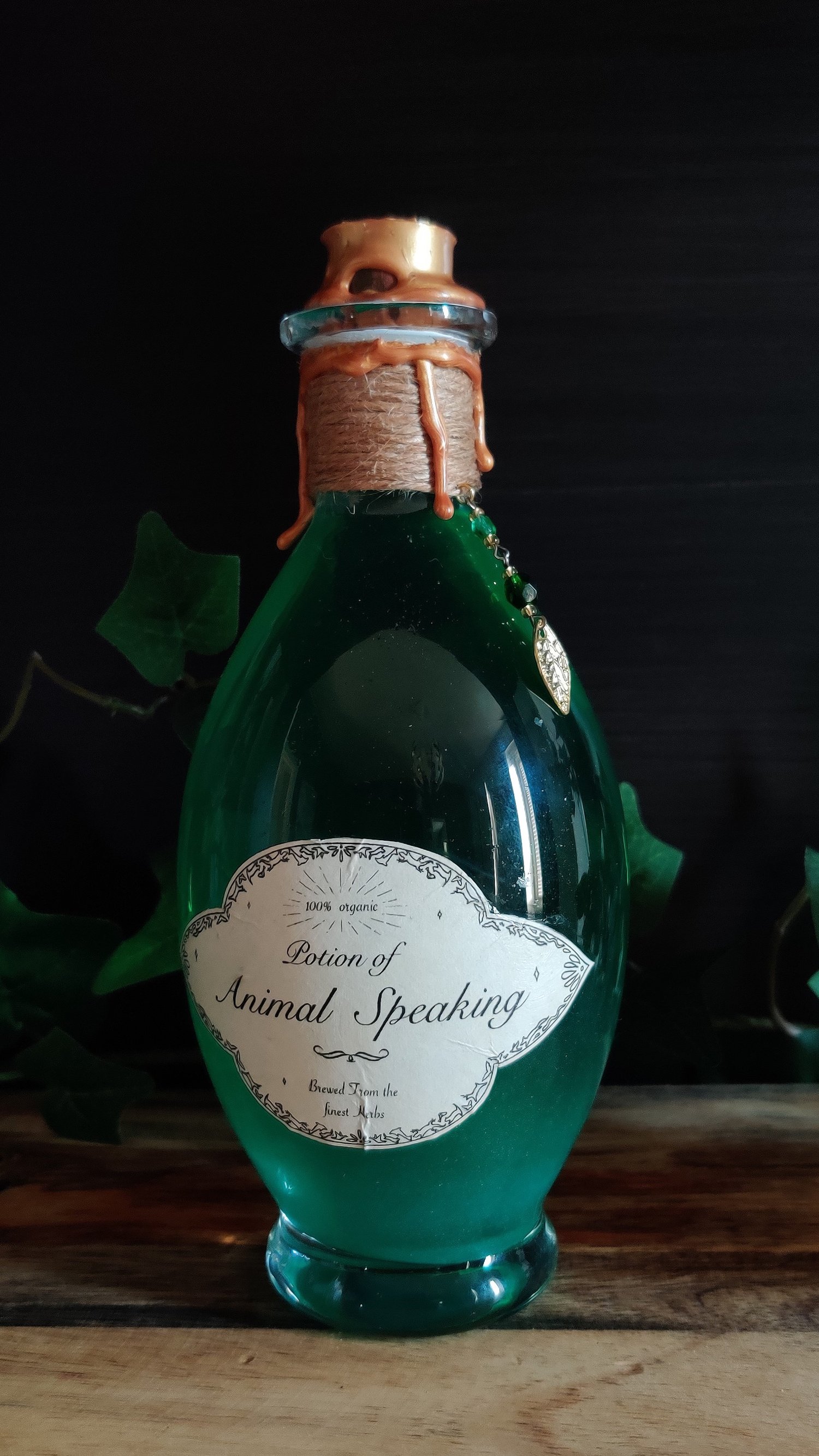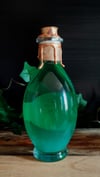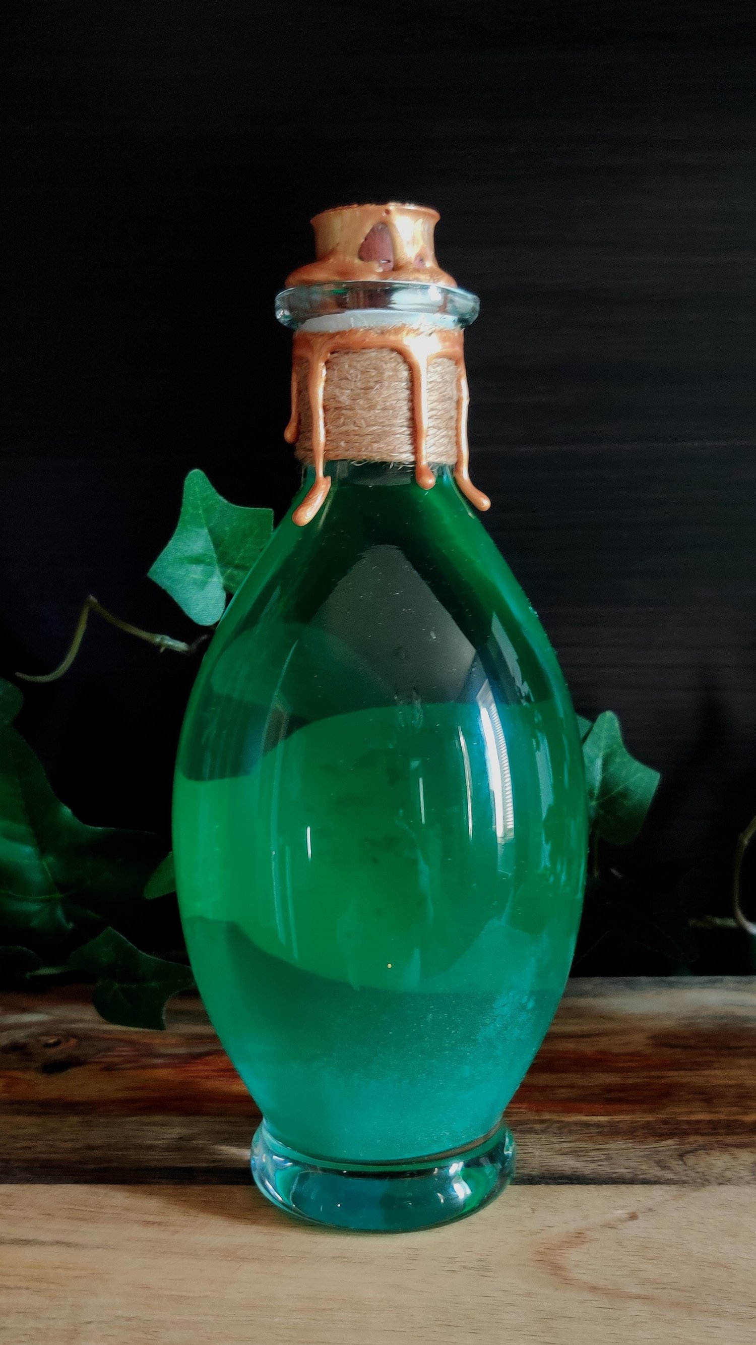 Pullossa on jaden väristä nestettä ja se on koristeltu käsintehdyllä etiketillä, sinetillä, juuttinarulla sekä helmillä ja riipuksella.