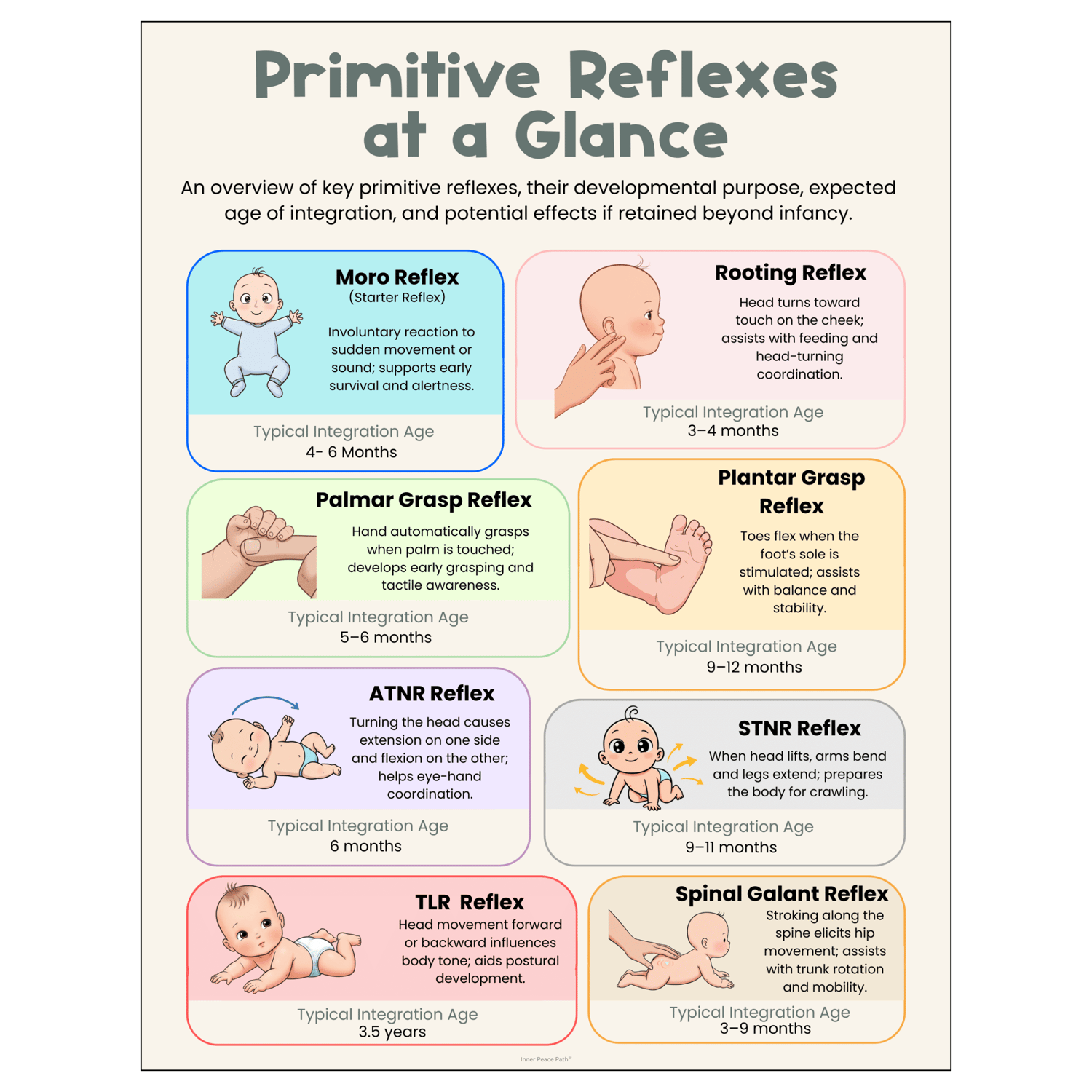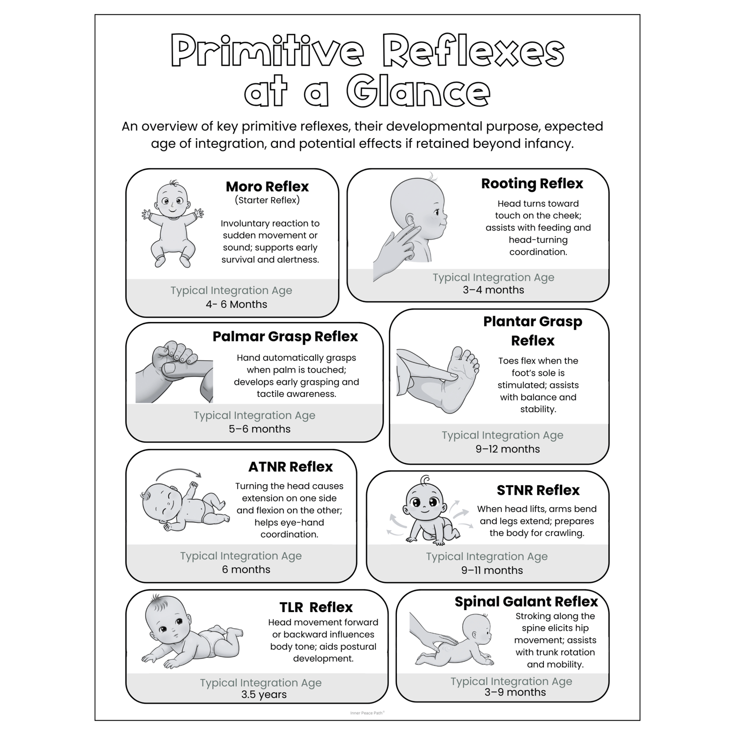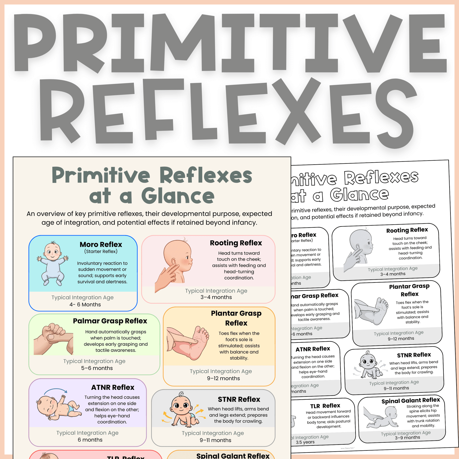 A clear, two-pages overview of key primitive reflexes — their purpose, age of integration, and possible effects if retained. Perfect for quick reference in therapy rooms, classrooms, or staff meetings.