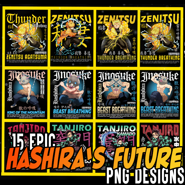 Experience the strength and camaraderie of Tanjiro, Inosuke, and Zenitsu with this exclusive set of 15 high-quality designs. This collection showcases the beloved trio from Demon Slayer: Kimetsu no Yaiba, highlighting their unique personalities, teamwork, and journey to become the future Hashira. These versatile designs are perfect for anime fans and creators looking to bring these iconic characters to life on custom apparel, posters, and more.