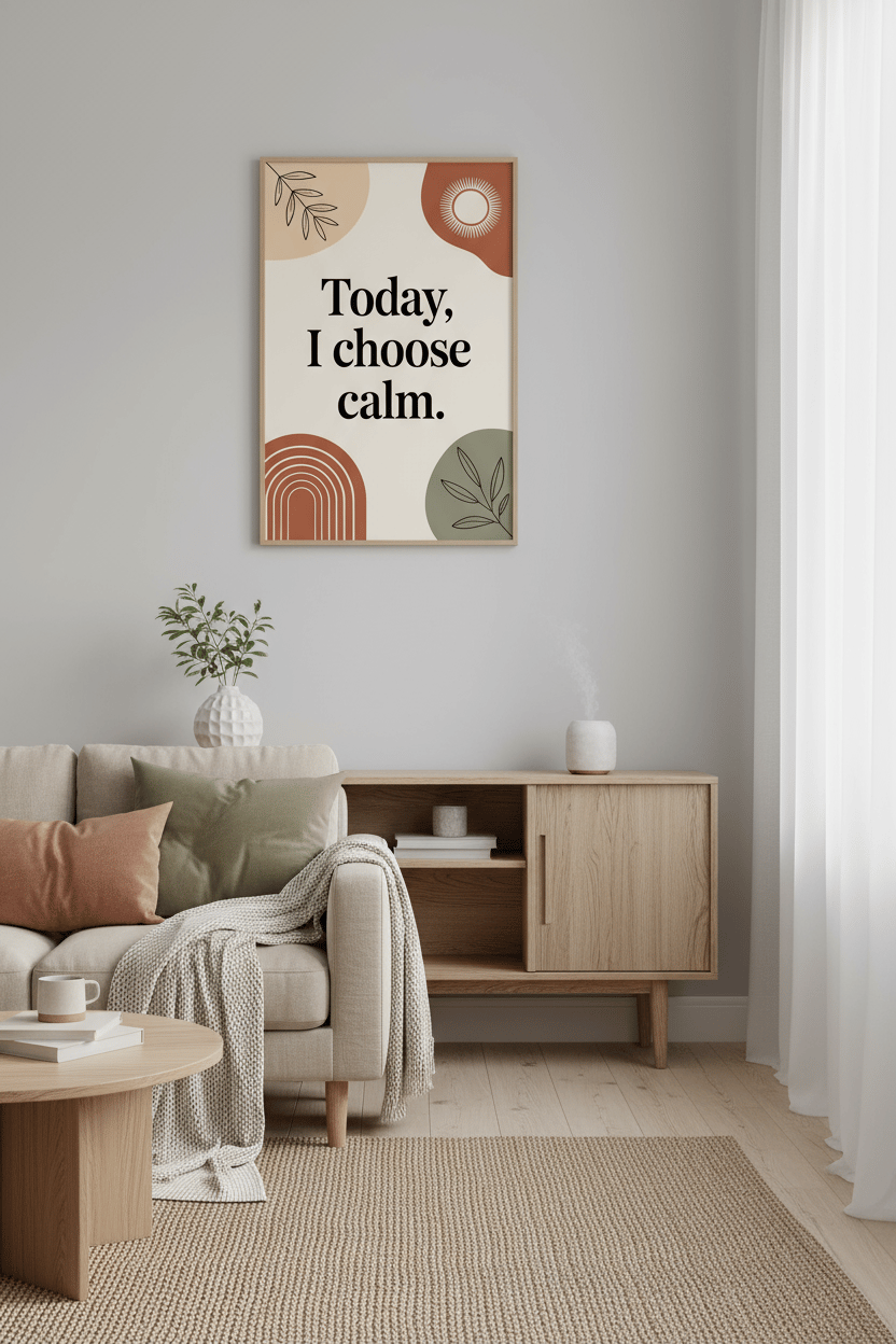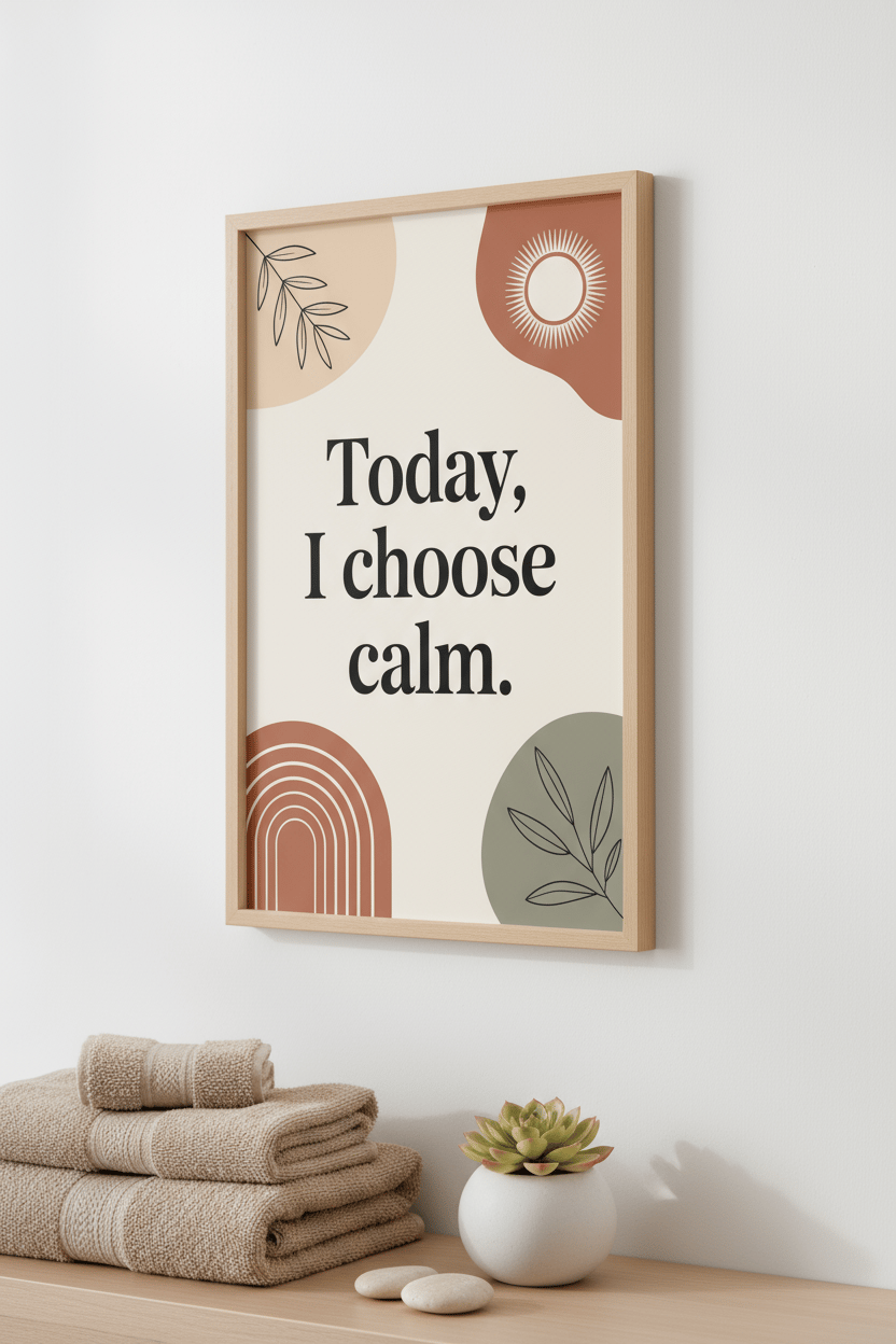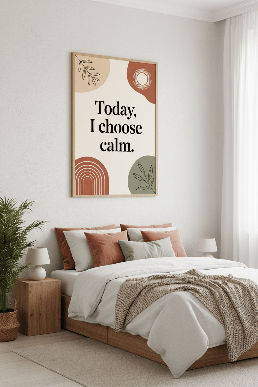 Set a peaceful tone in your space with this modern boho affirmation print: “Today, I choose calm.” Neutral clay, sage, and terracotta shapes with clean typography make an easy match for bedrooms, home offices, therapy rooms, yoga/meditation corners, and entryways. Print today, frame tonight—no shipping required.