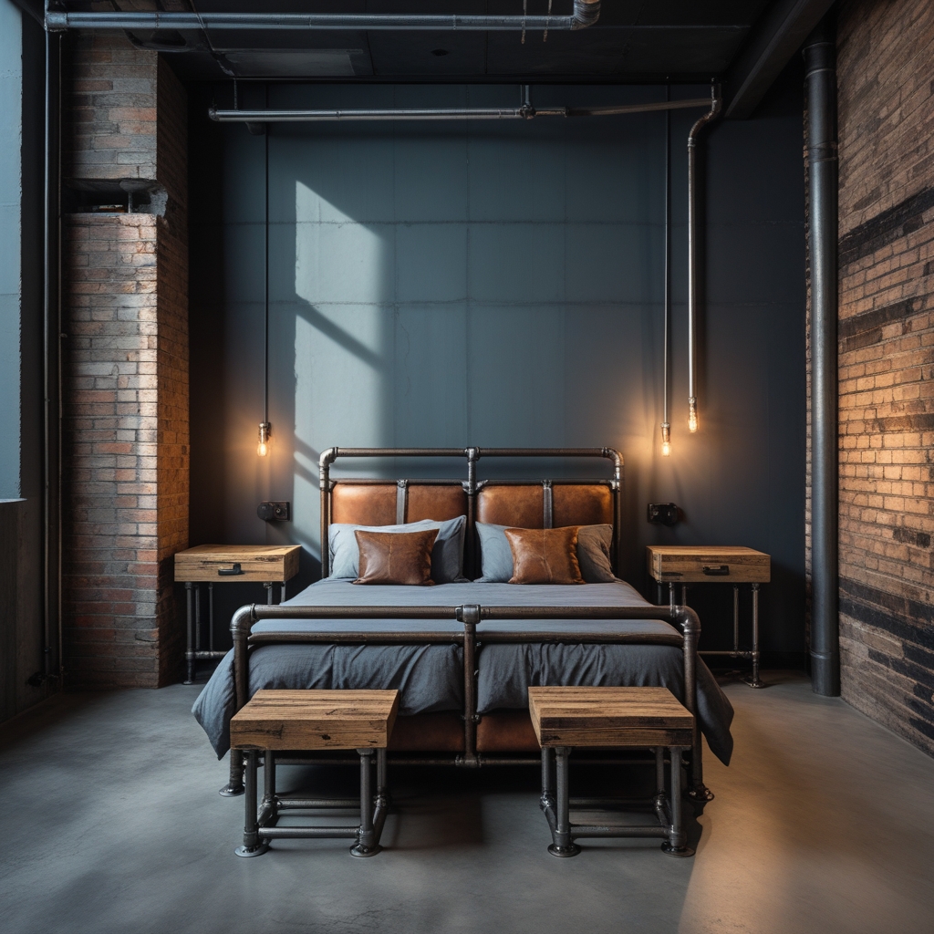 The interior of the bedroom features an industrial chic aesthetic, characterized by exposed brick or concrete walls, polished metal accents, and reclaimed wood furniture, with a predominantly dark color palette of greys, blues, and neutral tones. The room is windowless, with harsh overhead lighting casting dramatic shadows on the walls. The bed, adorned with distressed metal frames and worn leather upholstery, is positioned centrally against a wall, flanked by industrial-style side tables with metal pipes and reclaimed wood tops. The space exudes a sense of rugged sophistication, with industrial elements blending seamlessly with cozy, modern furnishings.