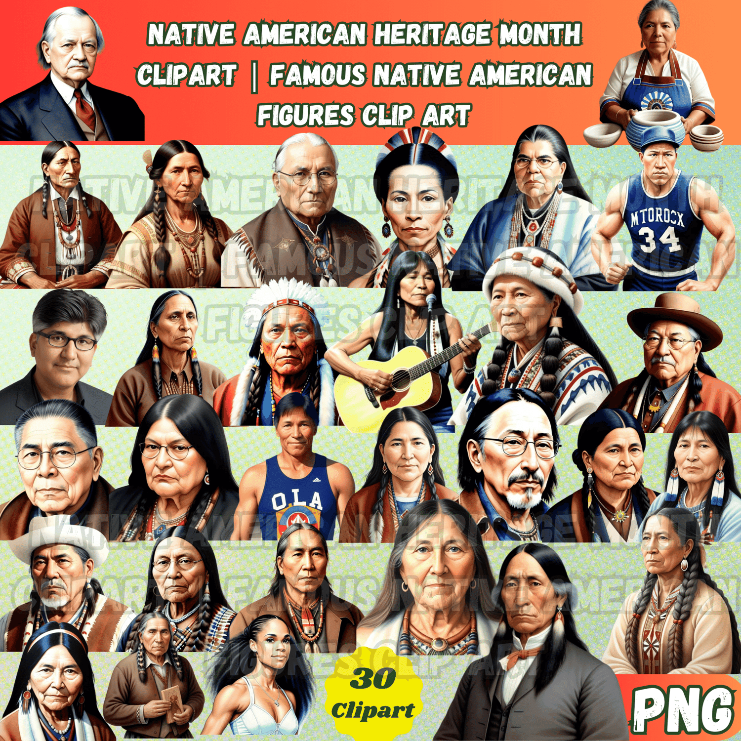 Native American Heritage Month Clipart features digital graphics depicting famous Native American figures, cultural symbols, and traditional elements associated with Indigenous peoples. These clipart collections are often used for educational materials, presentations, posters, and digital projects to celebrate Native American Heritage Month and honor the contributions of Native American individuals to history and culture.