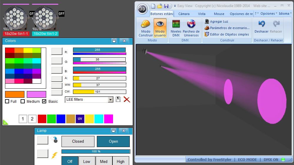 Esta Librería SSL2 está optimizada para trabajar con Magic 3d Easy View. Es decir para ver una representación 3D de las secuencias que estemos realizando con Freestyler, QLC+ o cualquier otro soft que se conecte con Magic 3d.