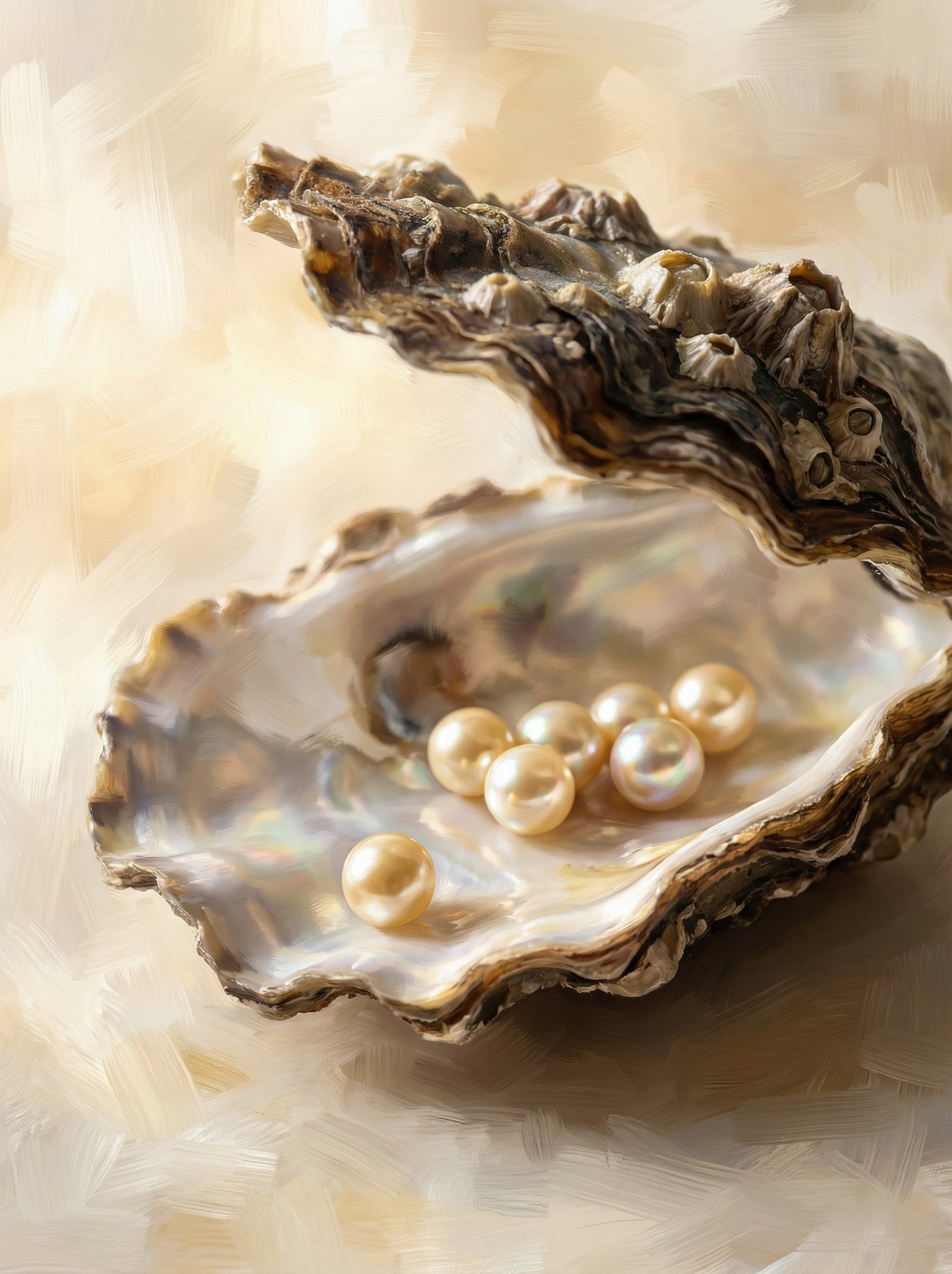 “Oysters & Pearls” captures the softness of linen, the natural form of fresh oysters, and the elegance of a pearl strand — all rendered in a warm vintage oil style.