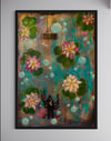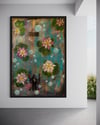 In Submerged Love, Zita Monori-Monory masterfully intertwines natural beauty with symbolic depth. Floating lotus blossoms, rendered in rich pinks and yellows, drift across a textured, aquatic backdrop in shades of teal and gold. Bubbles rise playfully around the lilies, adding a sense of lightness and fluidity to the piece. Anchoring this ethereal scene is a striking, shadowy figure beneath the surface—its multiple arms extending like tendrils, grasping at small red hearts and symbolic elements that hint at themes of longing, connection, and the unseen layers beneath love’s surface. Above it all, the words “LOVE YOU” subtly emerge, further deepening the emotional resonance of the work.