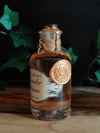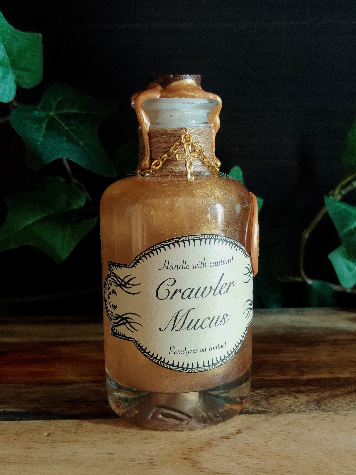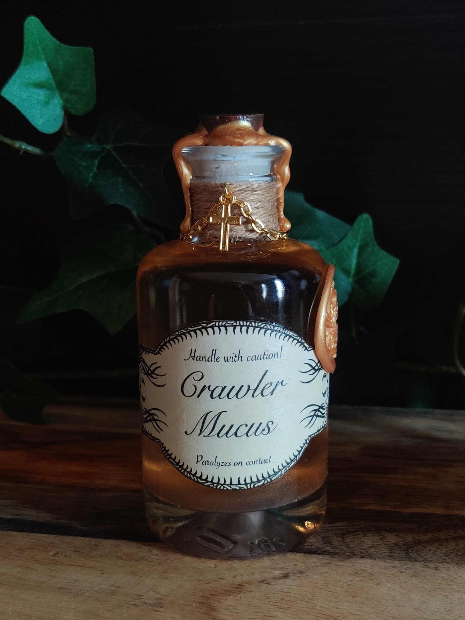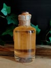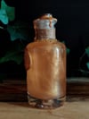Pullon neste on öljypohjaista ja paksua. Ravistettaessa öljy pyörteilee kultakuparin värisenä, jossa hennon kultainen hohto. Pullo on koristeltu käsin tehdyllä etiketillä, juuttinarulla ja sinetillä sekä ketjulla ja riipuksella.