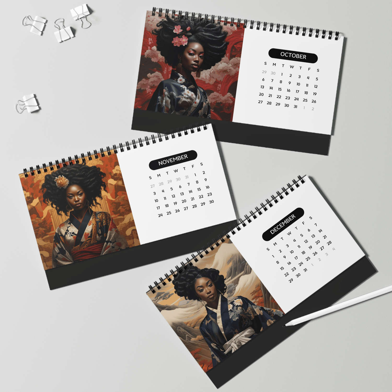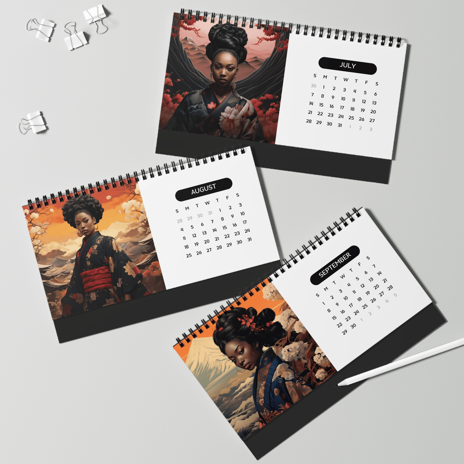Elevate your desk calendar game with our "Cultural Elegance 2024 Desk Calendar Template." This unique digital PLR (Private Label Rights) template offers a stunning fusion of cultures, featuring a beautiful black woman adorned in an Asian-inspired Kimono.