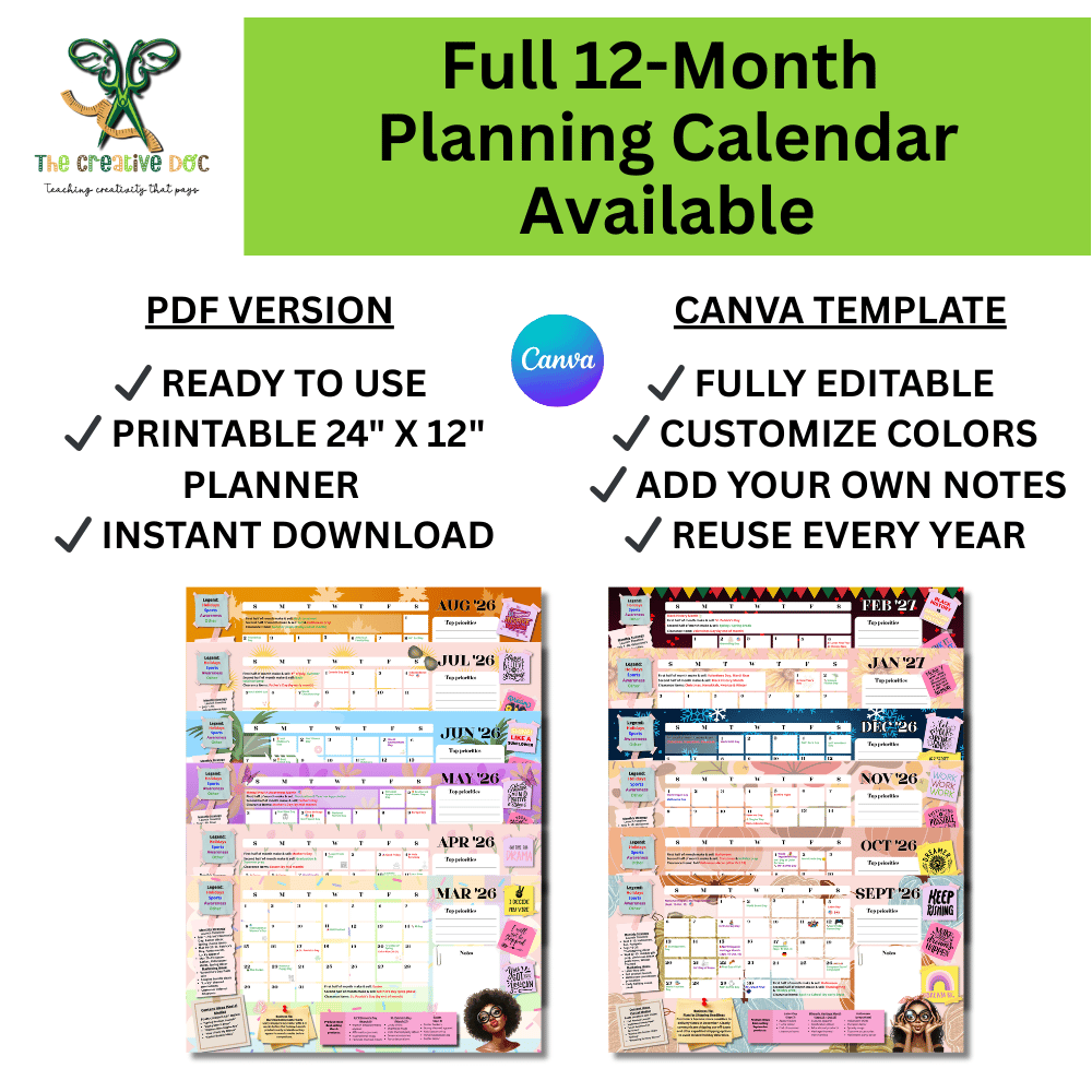 This products are a non-editable PDF version and an Editable Canva Link version of the planning calendar.