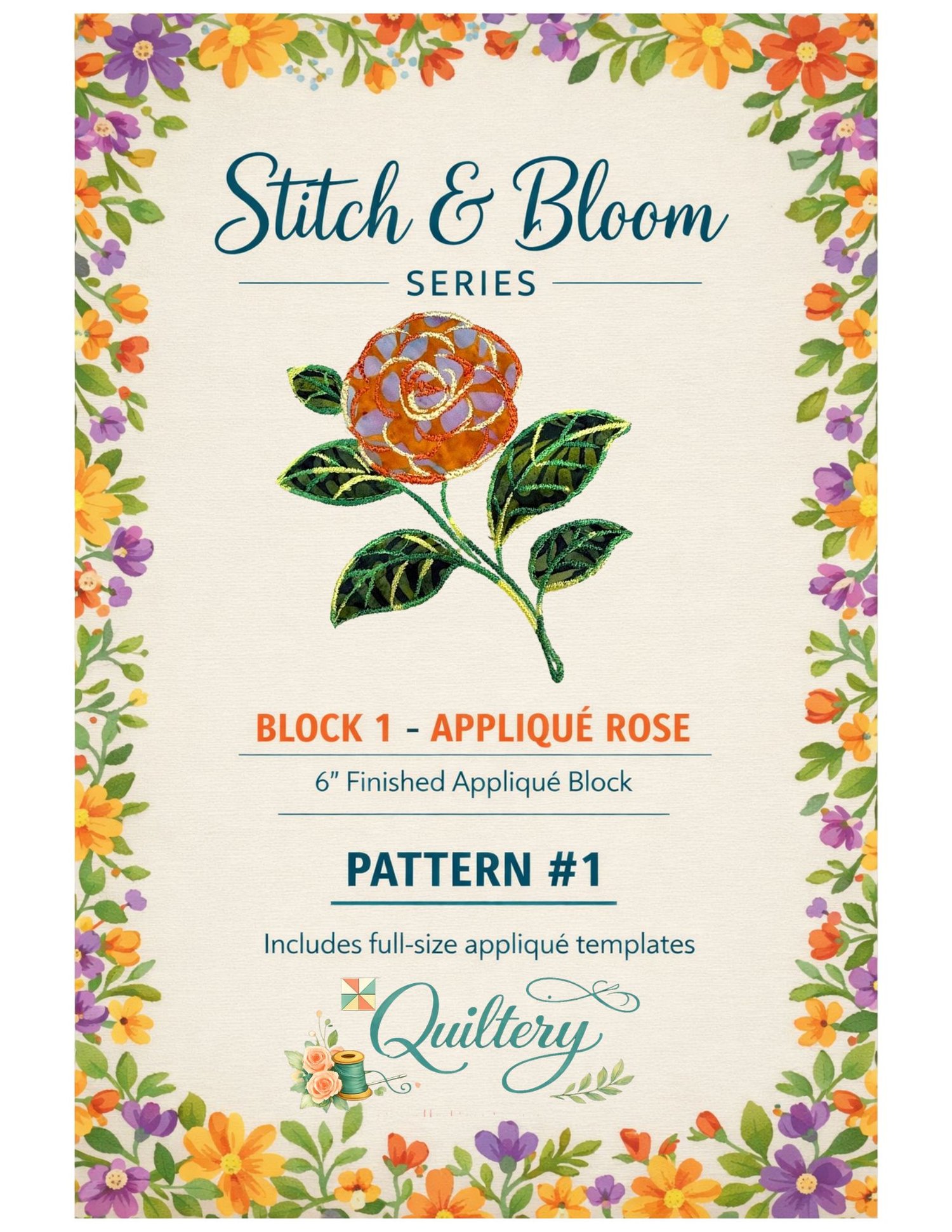 Stitch & Bloom Block Series. Applique block with a 6" finish. Pattern includes templates for tracing and SVG file for electronic cutters.