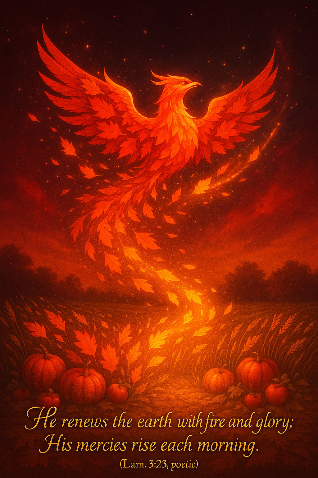 - π₯ Fiery phoenix ascending from autumn leaves and pumpkins