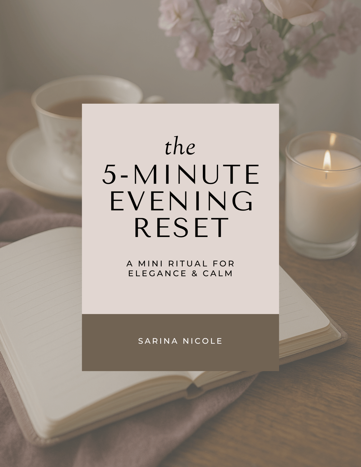 The 5-Minute Evening Reset is a guided mini-ritual designed for women who want more calm, clarity, and elegance in their lives, without adding more to their to-do list.