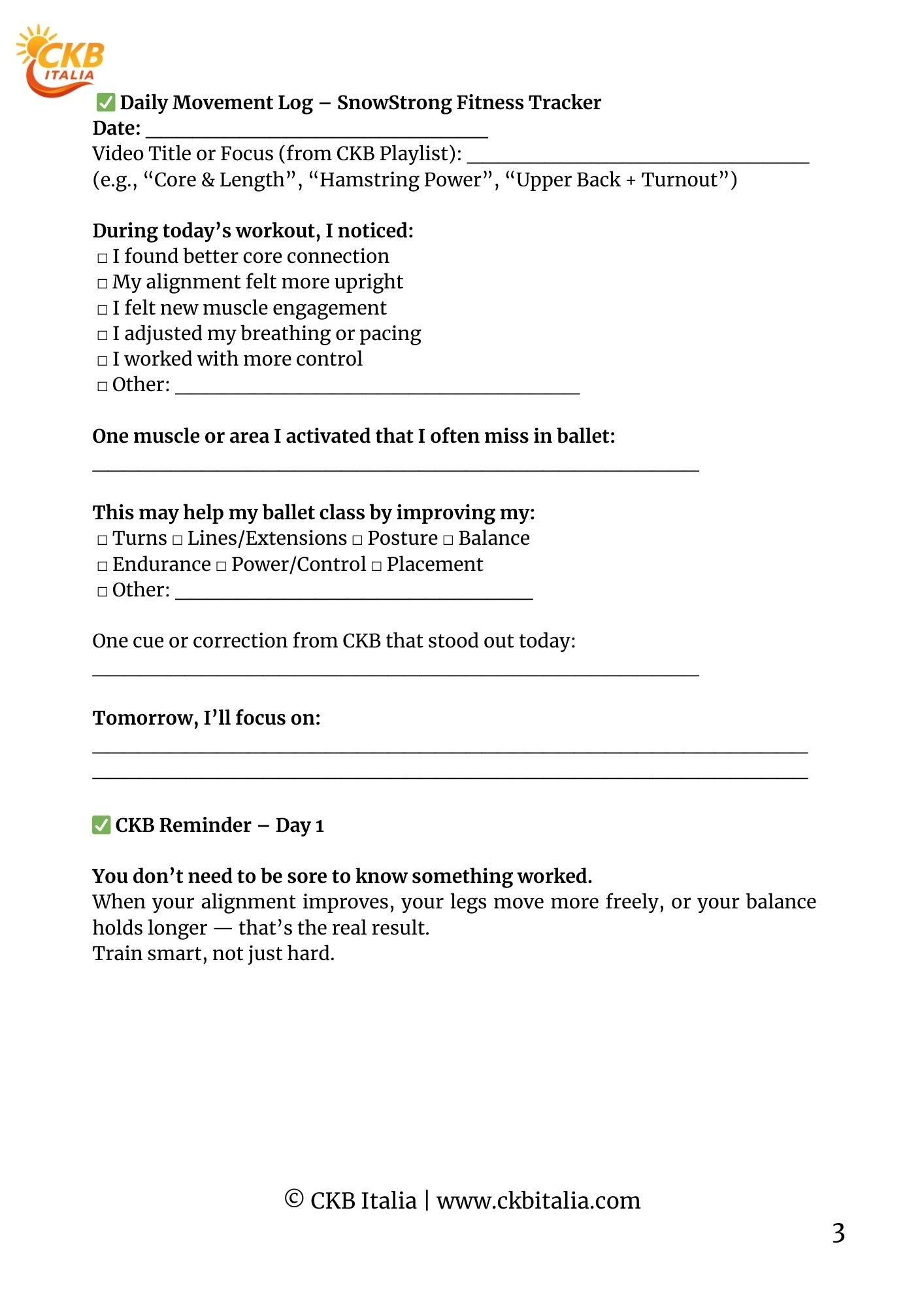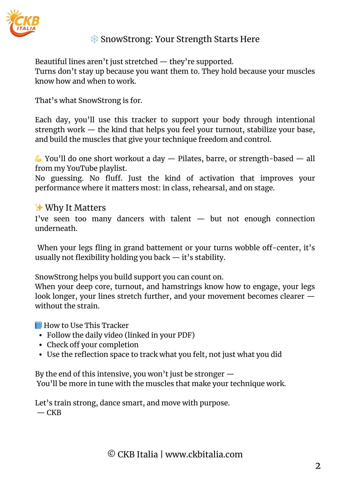 SnowStrong is a conditioning and awareness tracker created specifically for ballet dancers who want to support their technique through consistent strength and alignment work.
