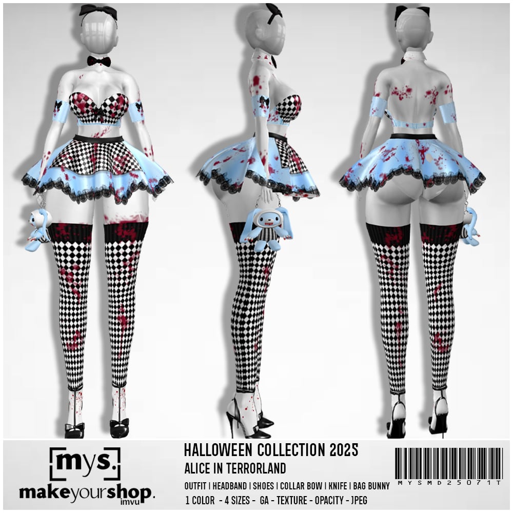 ALICE IN TERROLAND: Outfit (top, skirt, panties and socks); shoes, bow headband, bag bunny, collar bow, knife