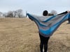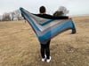 The sample was knit with Cauldron’s Path Yarns Sunrises in Mist (Color A), Fog (Color B), Storm Clouds (Color C), and Morning Blue (Color CC). (fingering weight, 100 grams, 475 yards each) and used 1250 yards