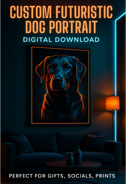 With our Custom Futuristic Dog Portrait, we create a one-of-a-kind digital masterpiece in a glowing cyberpunk neon style that makes your furry friend look absolutely legendary.
