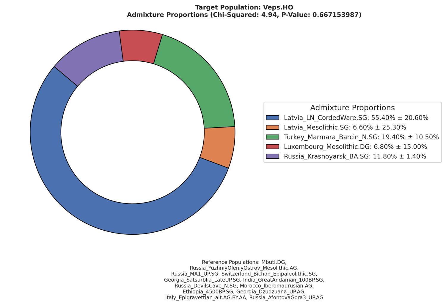 In terms of deeper, or paleolithic, admixture, the Veps descend predominantly from the Dzudzuana cluster, which is a common west eurasian source of ancestry all west eurasians have DNA from. The Anatolian neolithic farmers descended entirely from Dzudzuana, whereas the Caucasus hunter gatherers descended mostly from Dzudzuana. Aside from Dzudzuana ancestry, the Veps also have a significant portion of ancient north eurasian, western hunter gatherer, and siberian ancestry, which can not be ignored as it is the source of their language.