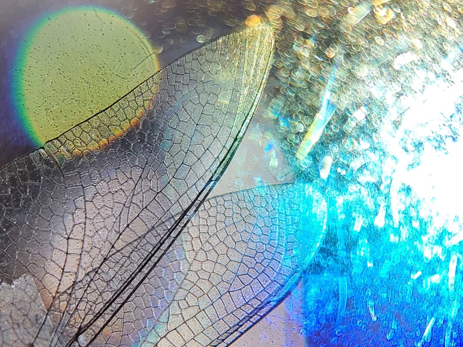 "Mystic Wings" is created with two dragonfly wings I found in my back yard. I placed the wings inside a beveled water glass. I positioned the glass in the beam of the rainbow flowing from my prisms. The yellow orb is a reflection of the sun in the glass. Hope you enjoy the image. Please feel free to leave a comment...would love to hear other points of view.